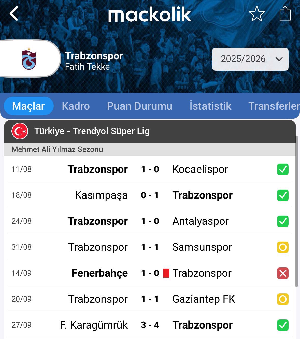 Trabzonspor, 2022-2023 sezonunda 13 puanla 7. sırada, 2023-2024 sezonunda 12 puanla 5. sırada, 2024-2025 sezonunun ilk 7 haftasında 9 puan toplayarak 10. sırada yer almıştı.