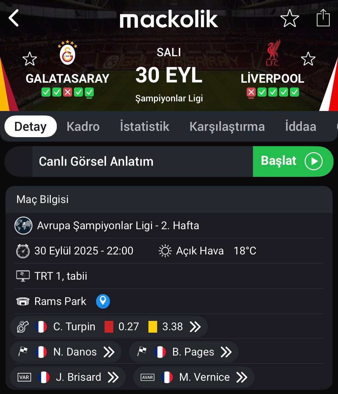 RAMS Park'ta yapılacak maç, saat 22.00'de başlayacak. Müsabakada Fransa Futbol Federasyonundan hakem Clement Turpin düdük çalacak. Tecrübeli hakemin yardımcılıklarını Nicolas Danos ile Benjamin Pages üstlenecek. Müsabakanın dördüncü hakemi ise Jeremy Stinat olacak.