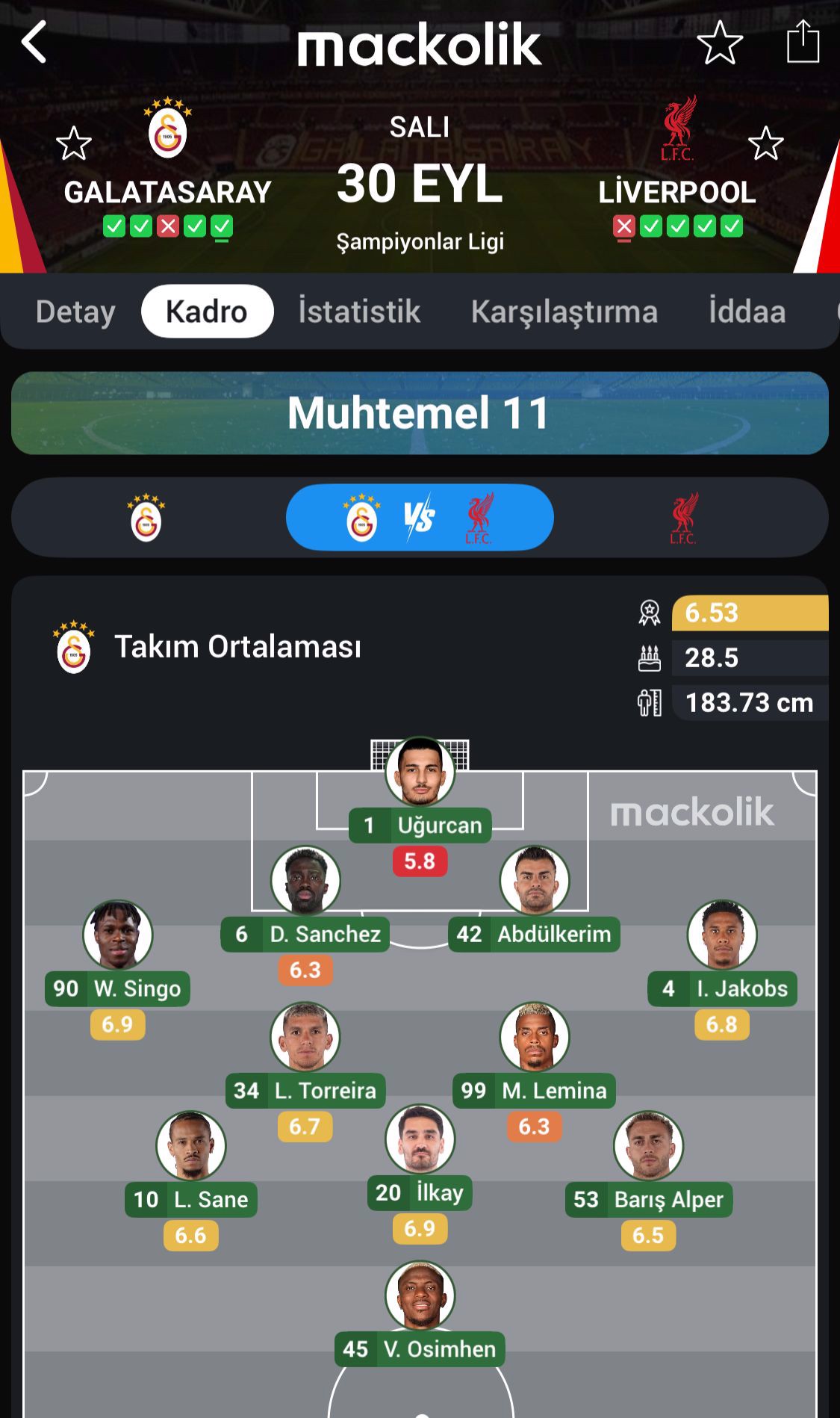 Galatasaray: Uğurcan, Singo, Sanchez, Abdülkerim, Jakobs, Torreira, Lemina, İlkay, Sane, Barış Alper Osimhen