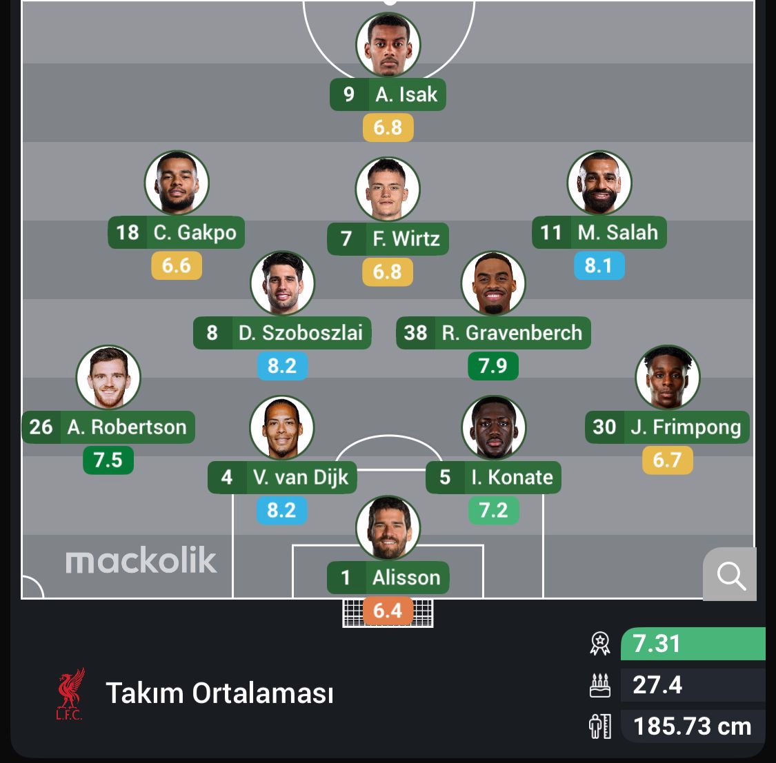Liverpool: Alisson, Frimpong, Konate, Van Djik, Robertson, Gravenberch, Szoboslai, Wirtz, Salah, Gakpo, Isak