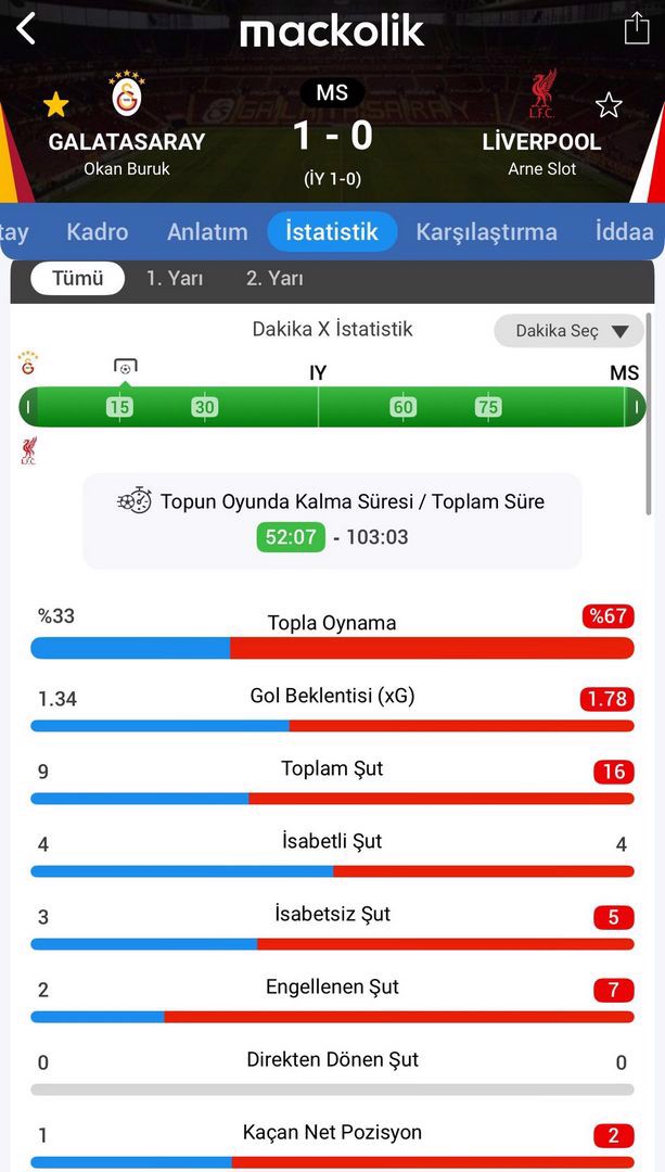 90+3. dakikada Szoboszlai'nin sol taraftan kullandığı kornerde Galatasaray savunması topu uzaklaştırdı. Ceza yayında meşin yuvarlakla buluşan Mac Allister'ın vuruşunda top yandan auta gitti.