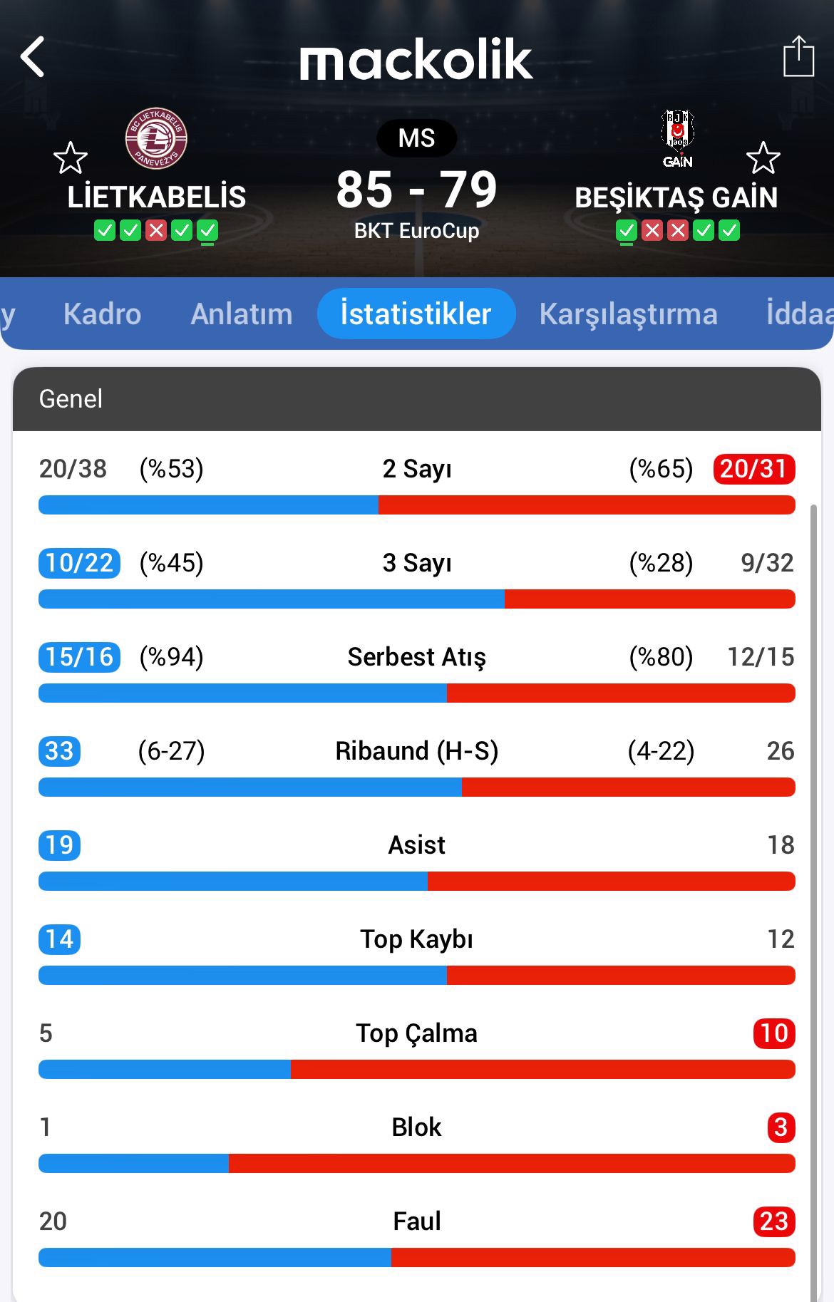 Siyah-beyazlılar, üçüncü periyodu da 57-55 üstün bitirdi. Dördüncü ve son çeyrekte daha etkili oynayan Lietkabelis, karşılaşmadan 85-79 galip ayrıldı.