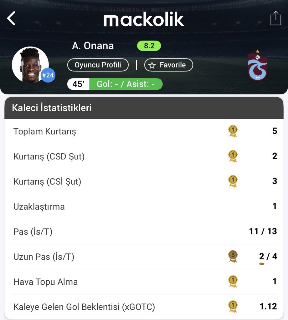 Trabzonspor'un kalecisi Andre Onana sergilediği performansla ilk yarıya damga vurdu.