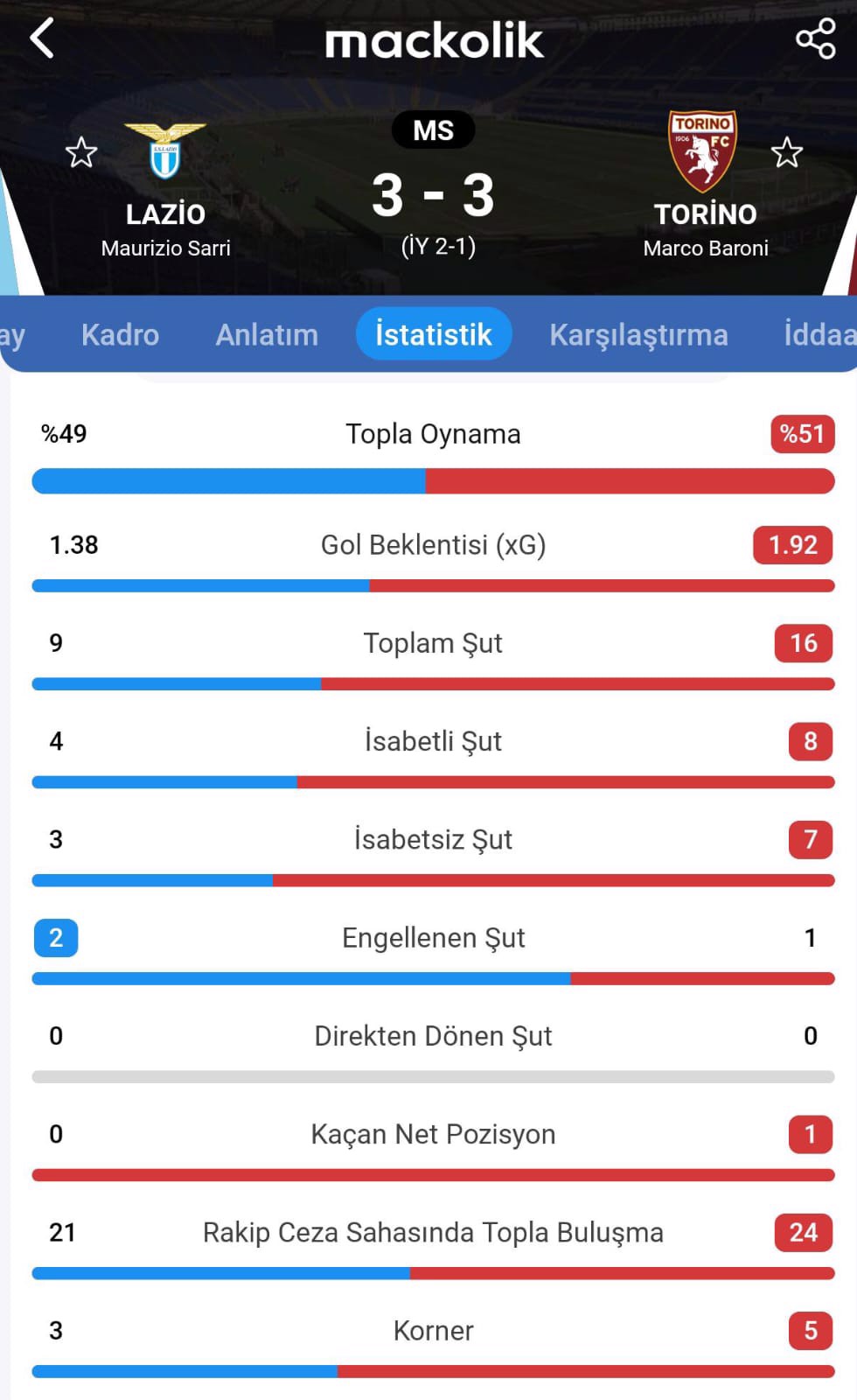 Lazio ise 24. ve 40. dakikalarda Cancellieri'nin attığı gollerle ilk yarıyı 2-1 üstün tamamladı.
