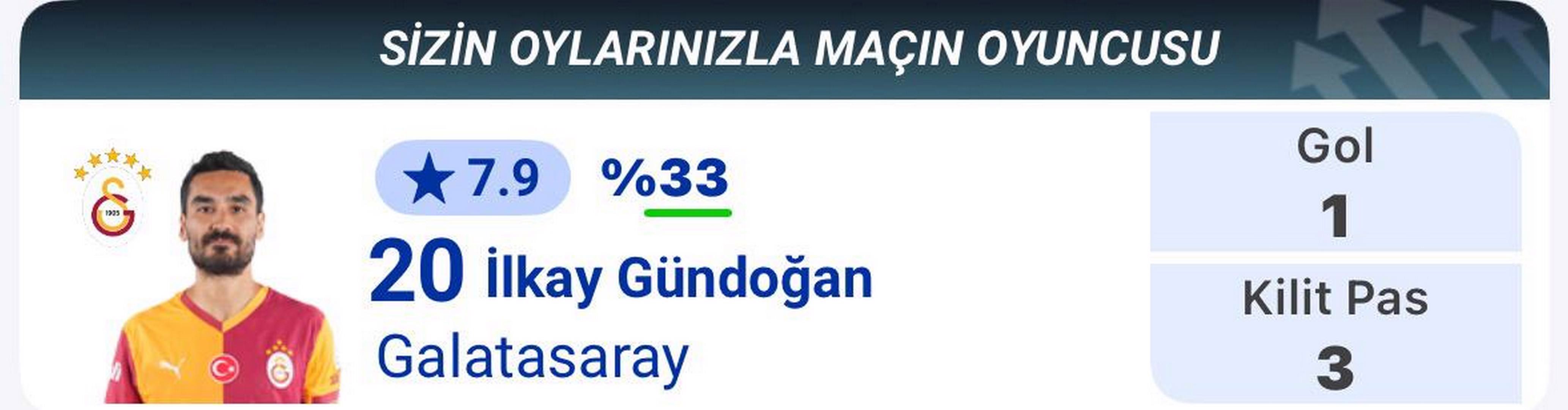 Galatasaray'ın orta sahası İlkay Gündoğan sizin oylarınızla 'Maçın Oyuncusu' seçildi.