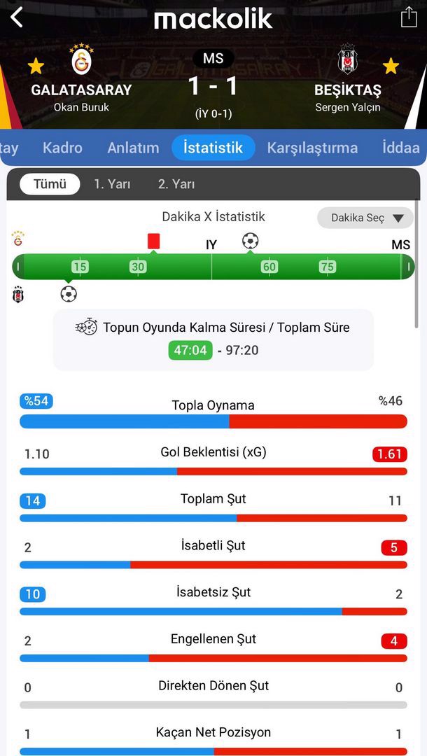 Siyah-beyazlılar soyunma odasına 1-0 önde girdi. Beşiktaş, Kasım 2010'dan bu yana Galatasaray'a konuk olduğu bir Süper Lig maçının ilk yarısını ilk kez galip tamamladı.