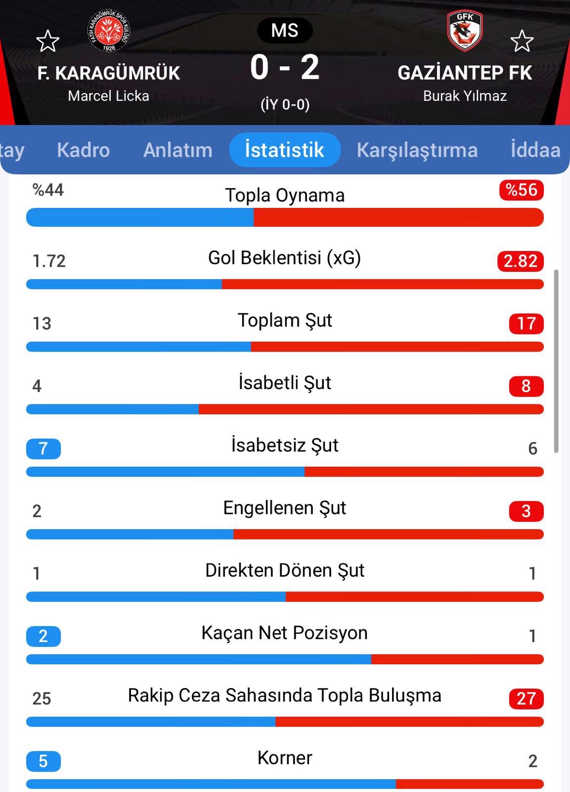 Öte yandan bu maçla birlikte Gaziantep FK, Burak Yılmaz yönetimine geçtiğinden beri 6 maçtır kaybetmeyerek yenilmezlik serisini sürdürdü.