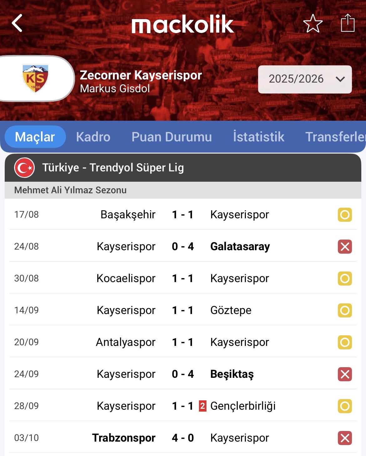 Sezona Başakşehir beraberliğiyle başlayan Kayserispor yoluna Galatasaray mağlubiyetiyle devam etmişti.