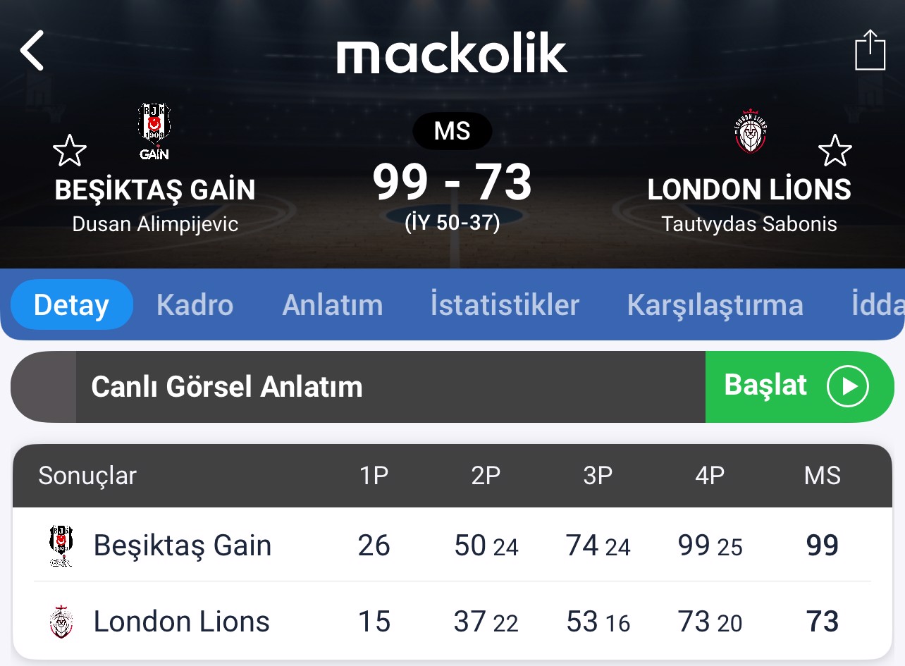 Son periyotta da parkedeki oyun üstünlüğünü kuran Beşiktaş Gain, London Lions'i 99-73 mağlup ederek BKT EuroCup B Grubu'nda ilk galibiyetini aldı.