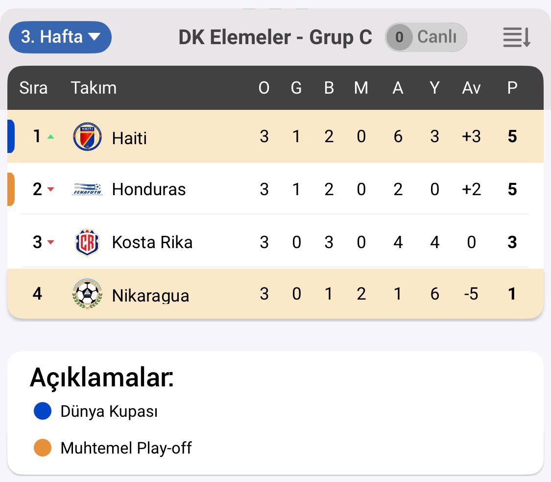 5 puanı bulunan Haiti'yi Honduras aynı puanla takip ediyor. Grubun bir diğer ekibi olan Kosta Rika 3 puanla 3. sırada yer alırken ve son sırada ise 1 puanla Nikaragua bulunuyor.