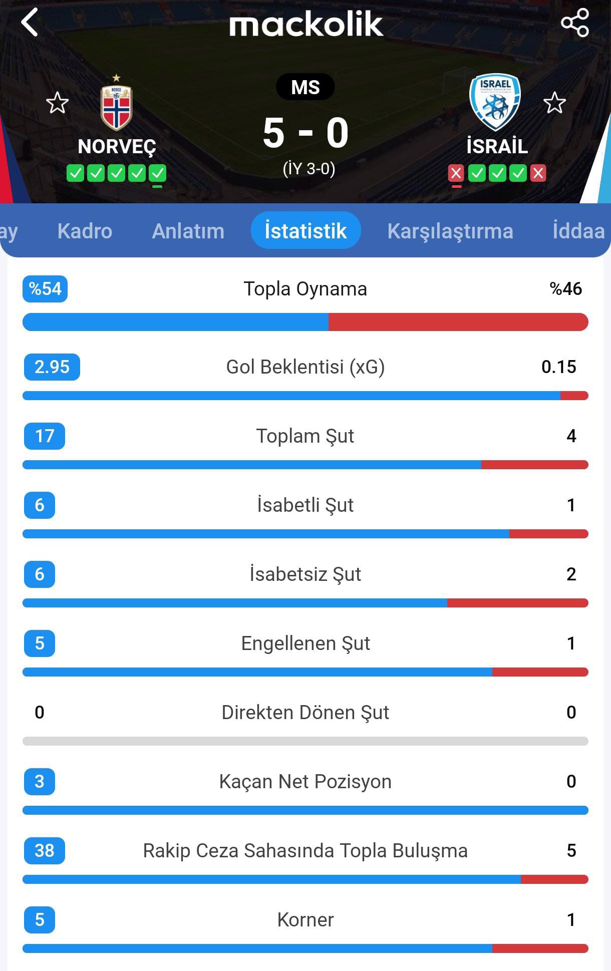 Mücadelede başka gol olmadı ve Norveç, İsrail'i 5-0 mağlup etti.