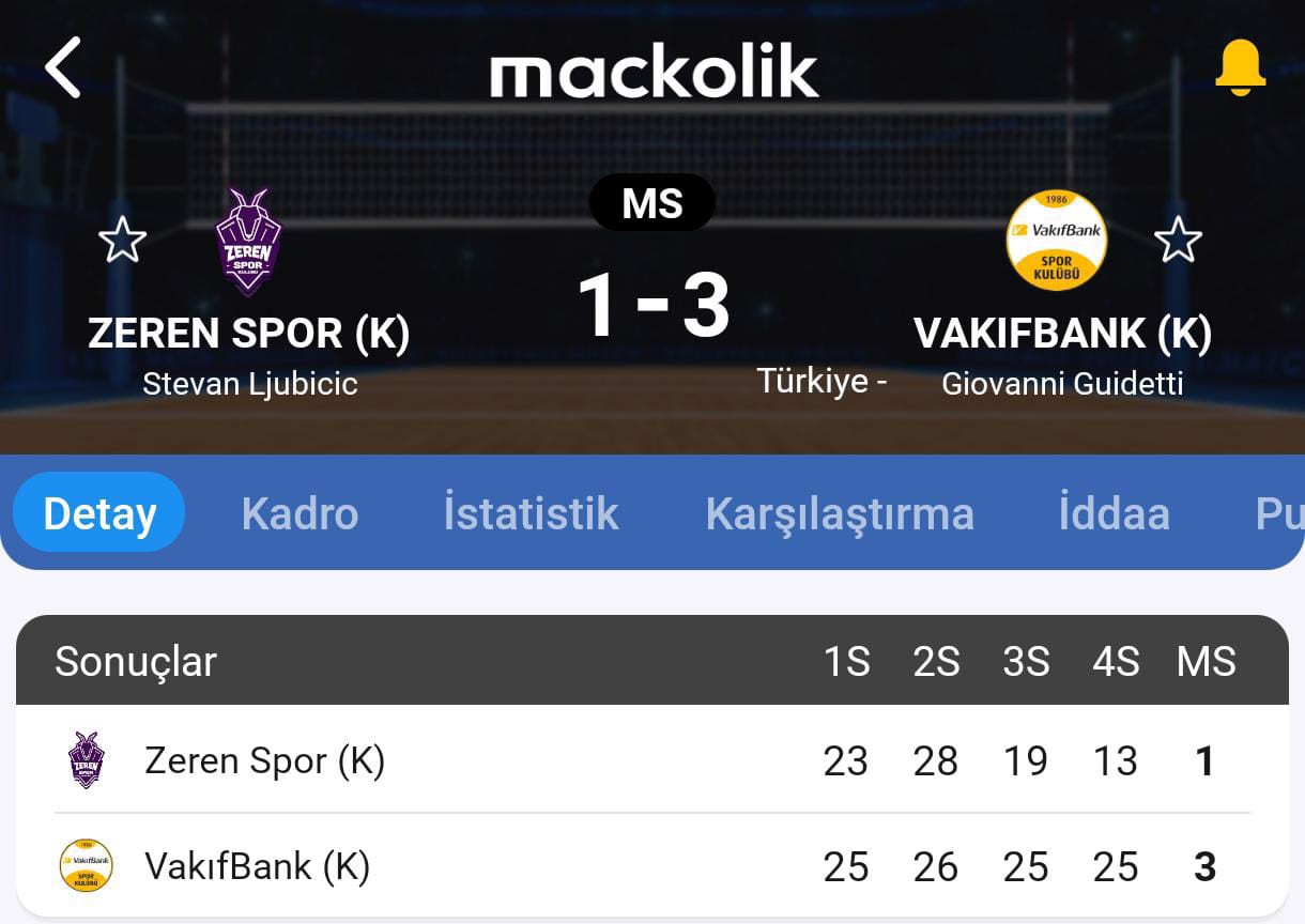 Guidetti'nin öğrencileri dördüncü seti 25-13 kazanarak, Zeren Spor'u 3-1 mağlup etti. VakıfBank'ta Markova 29 sayıyla oynadı.