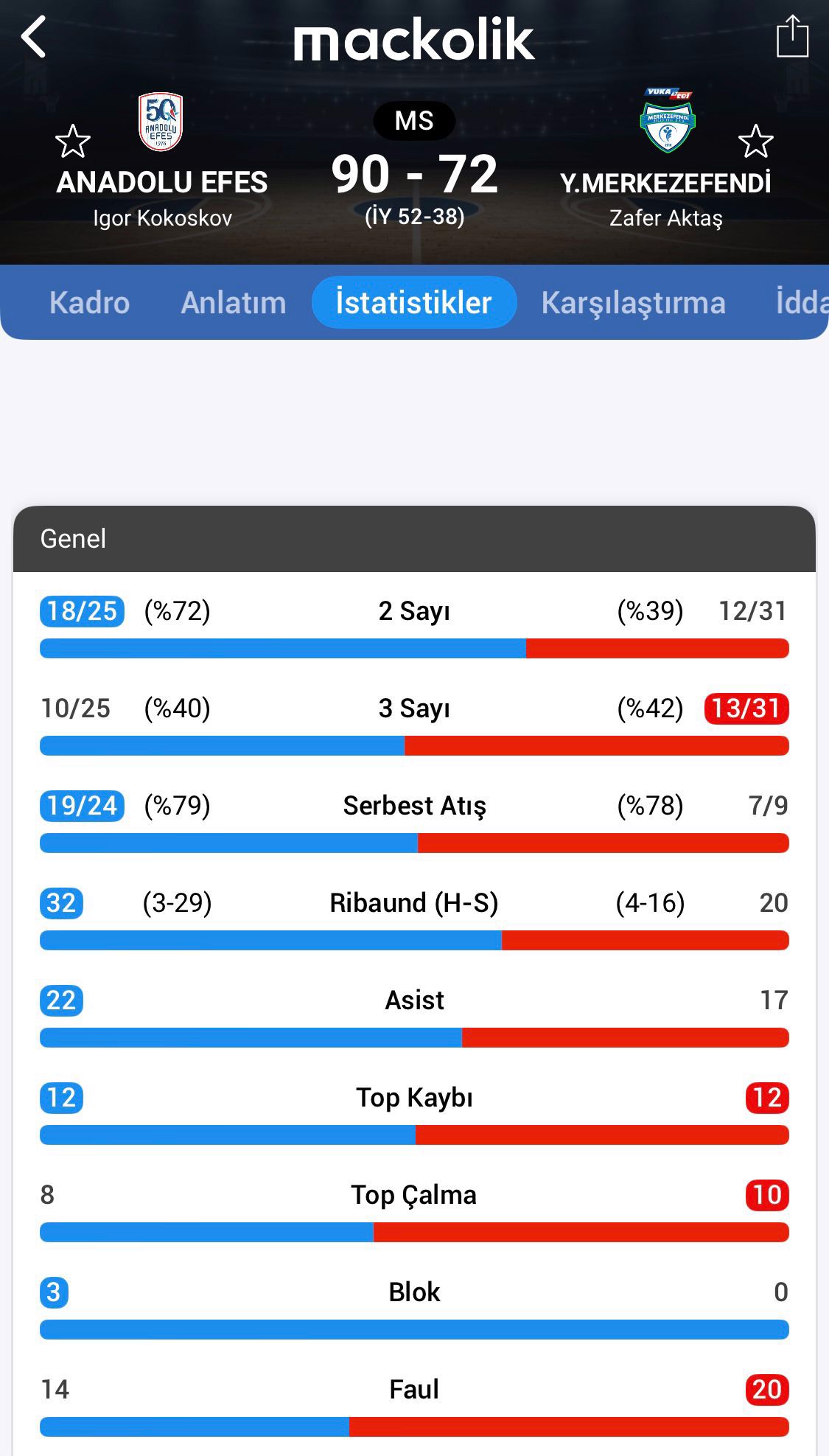 Turkcell Basketbol Gelişim Merkezi'nde başlayan müsabakanın ilk yarısı ev sahibi ekibin 52-38 üstünlüğüyle sona erdi. İkinci yarıda da skor üstünlüğünü elinde tutan Anadolu Efes, karşılaşmayı 90-72 kazanarak ligdeki galibiyet serisini sürdürdü. Konuk ekip Yukatel Merkezefendi ise üst üste ikinci yenilgisini aldı.