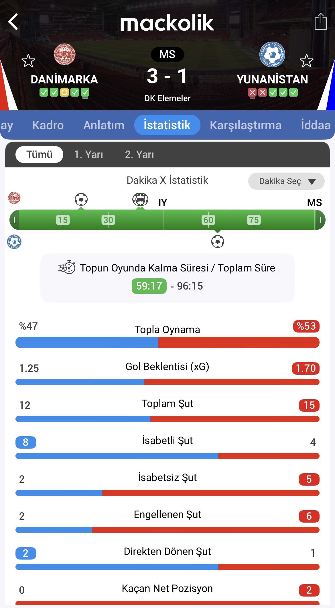 Tzolis, 63. dakikada kaydettiği golle farkı azaltsa da Danimarka karşılaşmanın kalan anlarında üstünlüğünü korumayı bildi ve maçtan 3-1'lik galibiyetle ayrıldı.
