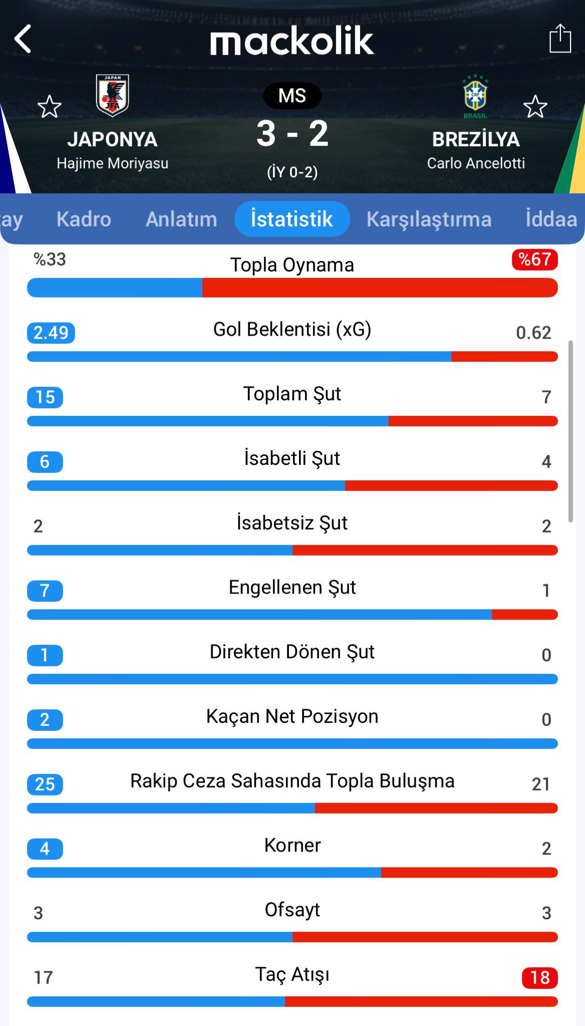 Kalan dakikalarda başka gol olmayınca Japonya, Brezilya'yı 3-2 mağlup etti.