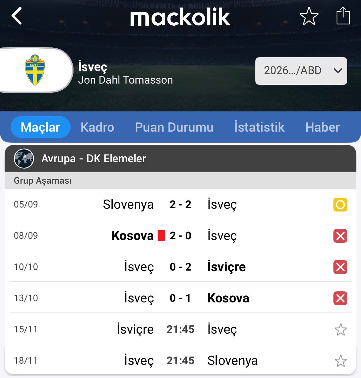 Tomasson yönetimindeki İsveç, 2026 FIFA Dünya Kupası Avrupa Elemeleri B Grubu'nda çıktığı 4 maçta bir puan elde ederek son sırada yer aldı.