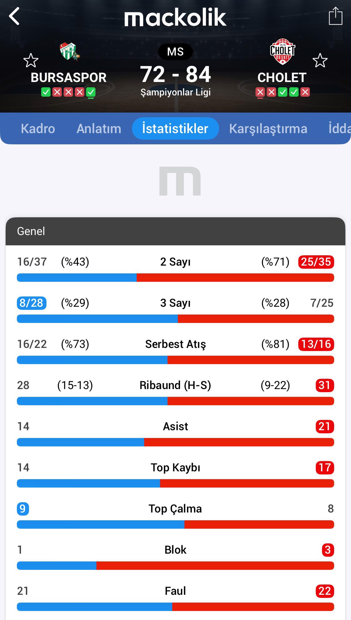Temsilcilerimizden Bursaspor, evinde Fransız ekiplerinden Cholet'i ağırladı. Mücadelenin ilk yarısını sadece bir sayı farkla 38-37 geride kapatan Bursaspor ikinci yarıda rakibine üstünlük sağlayamadı ve müsabakadan 84-72 mağlup ayrıldı.