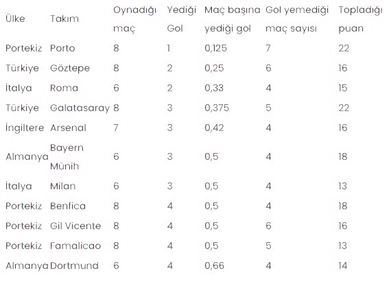 Avrupa'nın en büyük 10 liginde kalesinde 4'ten fazla gole izin vermeyen takımların sıralaması şu şekilde oluştu: