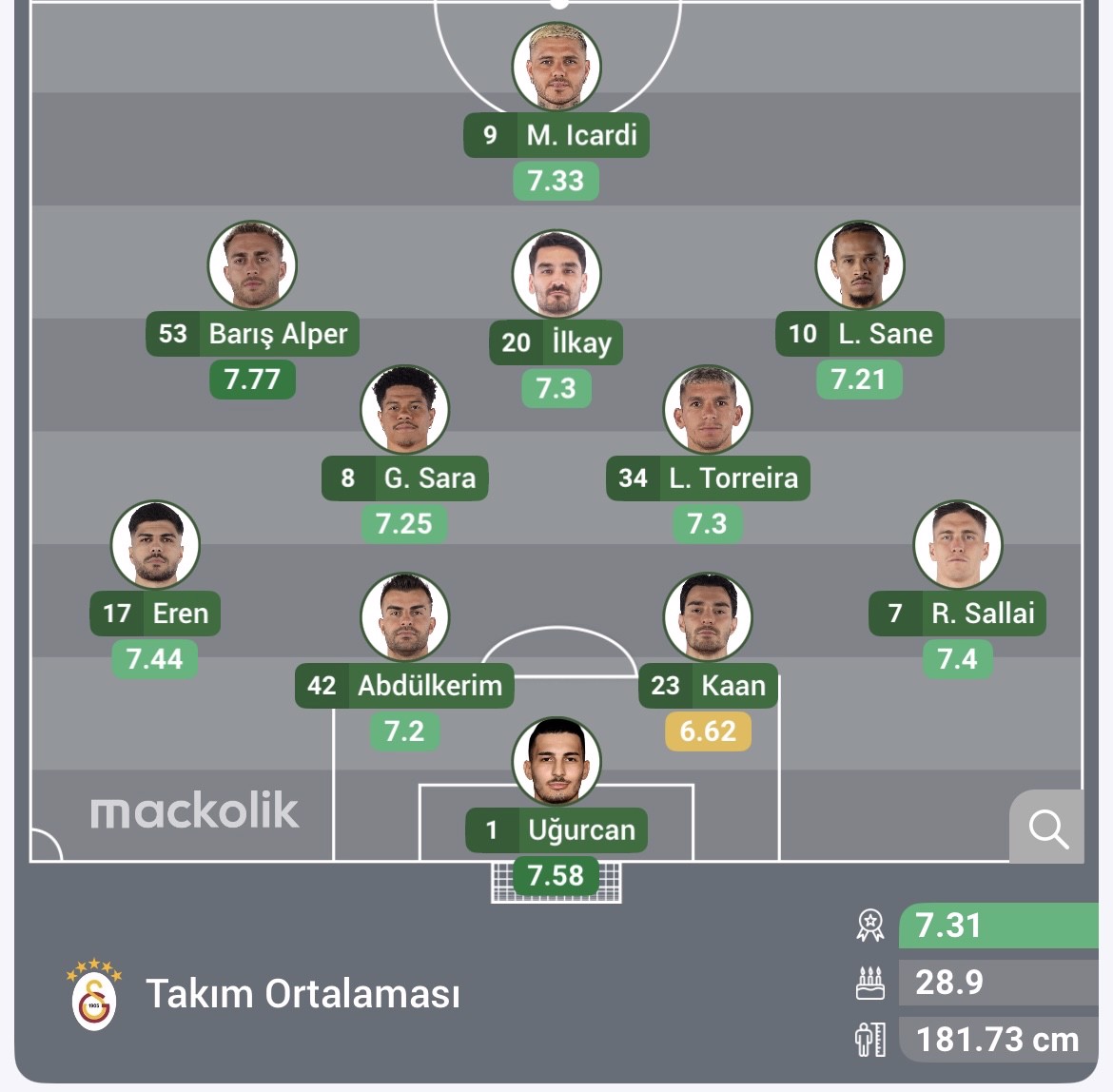 Galatasaray: Uğurcan Çakır, Sallai, Kaan Ayhan, Abdülkerim Bardakcı, Eren Elmalı, Torreira, Sara, Sane, İlkay Gündoğan, Barış Alper Yılmaz, Icardi