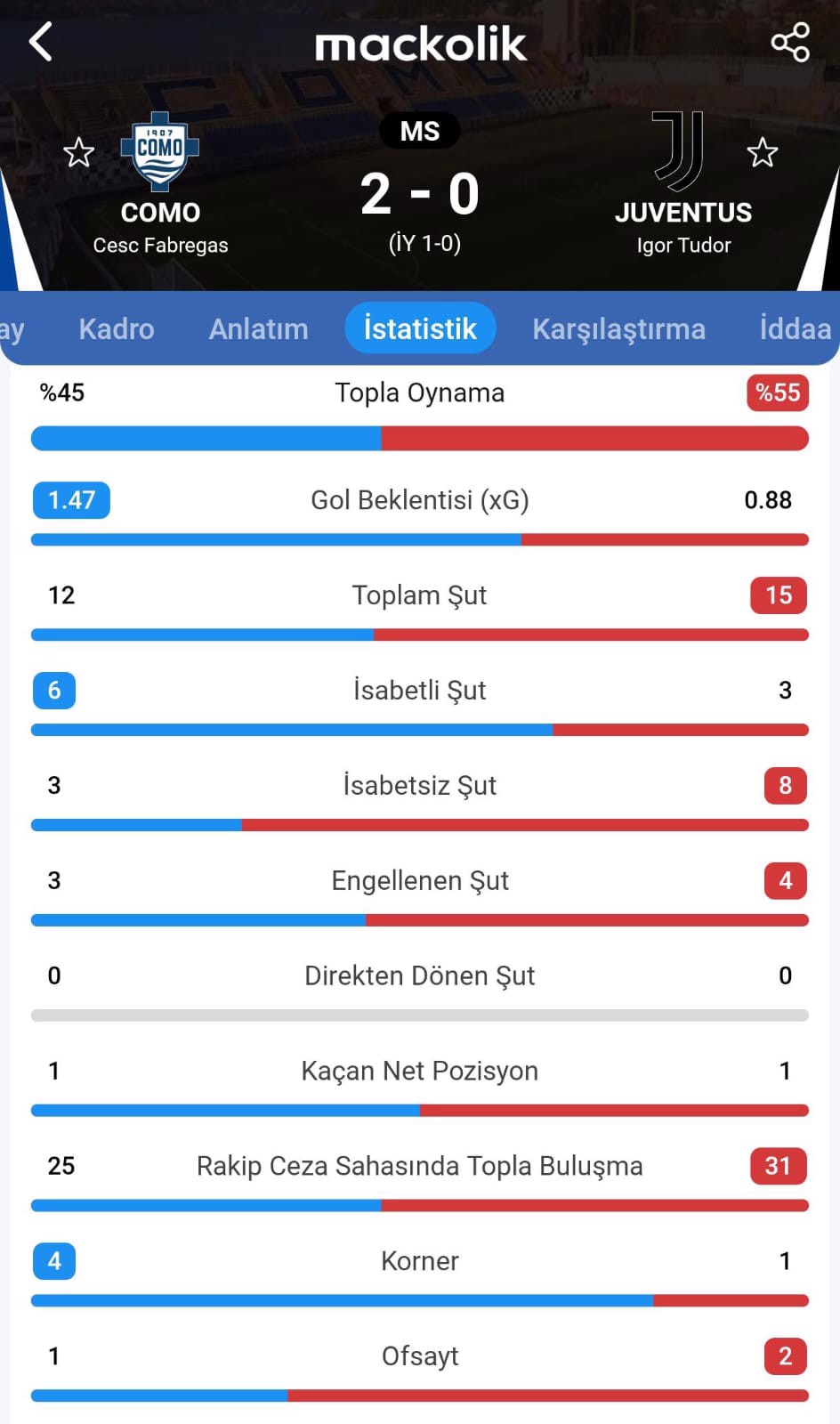 Karşılaşmanın ilk yarısı 1-0 Como üstünlüğüyle sonuçlandı.
