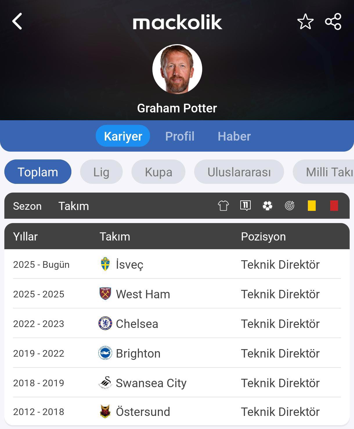 50 yaşındaki İngiliz teknik adam, İsveç futbolunu yakından tanıyor. Potter, 2011-2018 yılları arasında Östersunds FK'yi çalıştırmış, kulübü tarihte ilk kez Avrupa kupalarına taşımıştı. Ardından Swansea, Brighton, Chelsea ve son olarak West Ham'da görev yapmıştı.