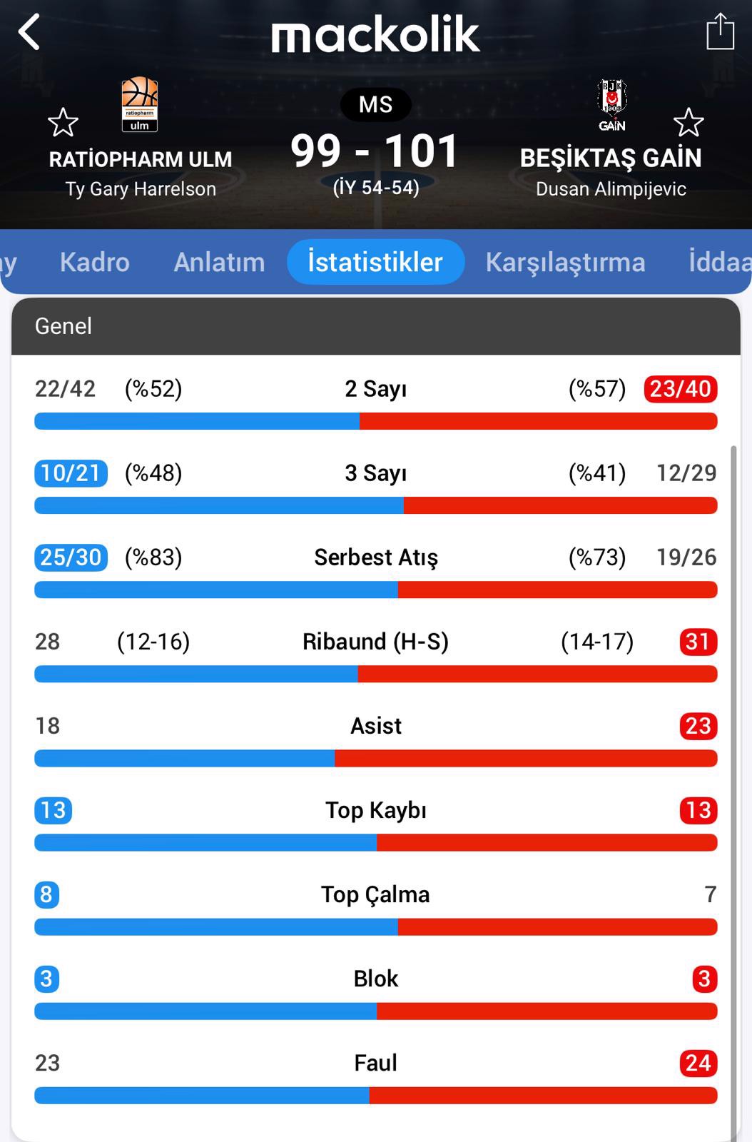 Öte yandan maçın en skorer oyuncusu Ratiopharm Ulm'dan attığı 25 sayıyla Christopher Ledlum olurken Beşiktaş Gain'in en skorer oyuncusu 19 sayıyla Anthony Brown oldu.