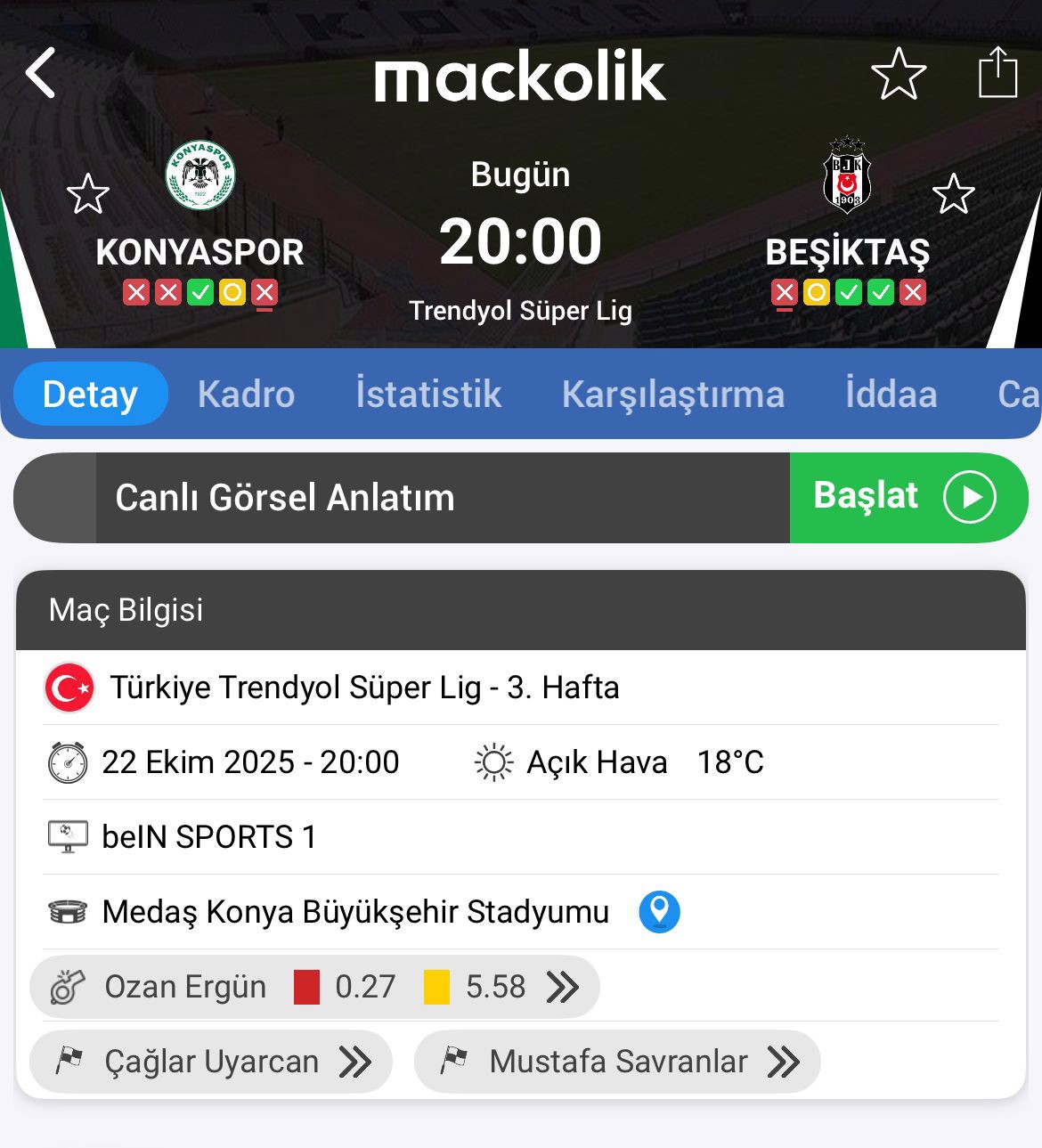 Süper Lig'in 3. haftasından ertelenen maçta Konyaspor, sahasında Beşiktaş'ı konuk edecek. Medaş Konya Büyükşehir Stadı'nda saat 20.00'de başlayacak mücadeleyi Ozan Ergün yönetecek.