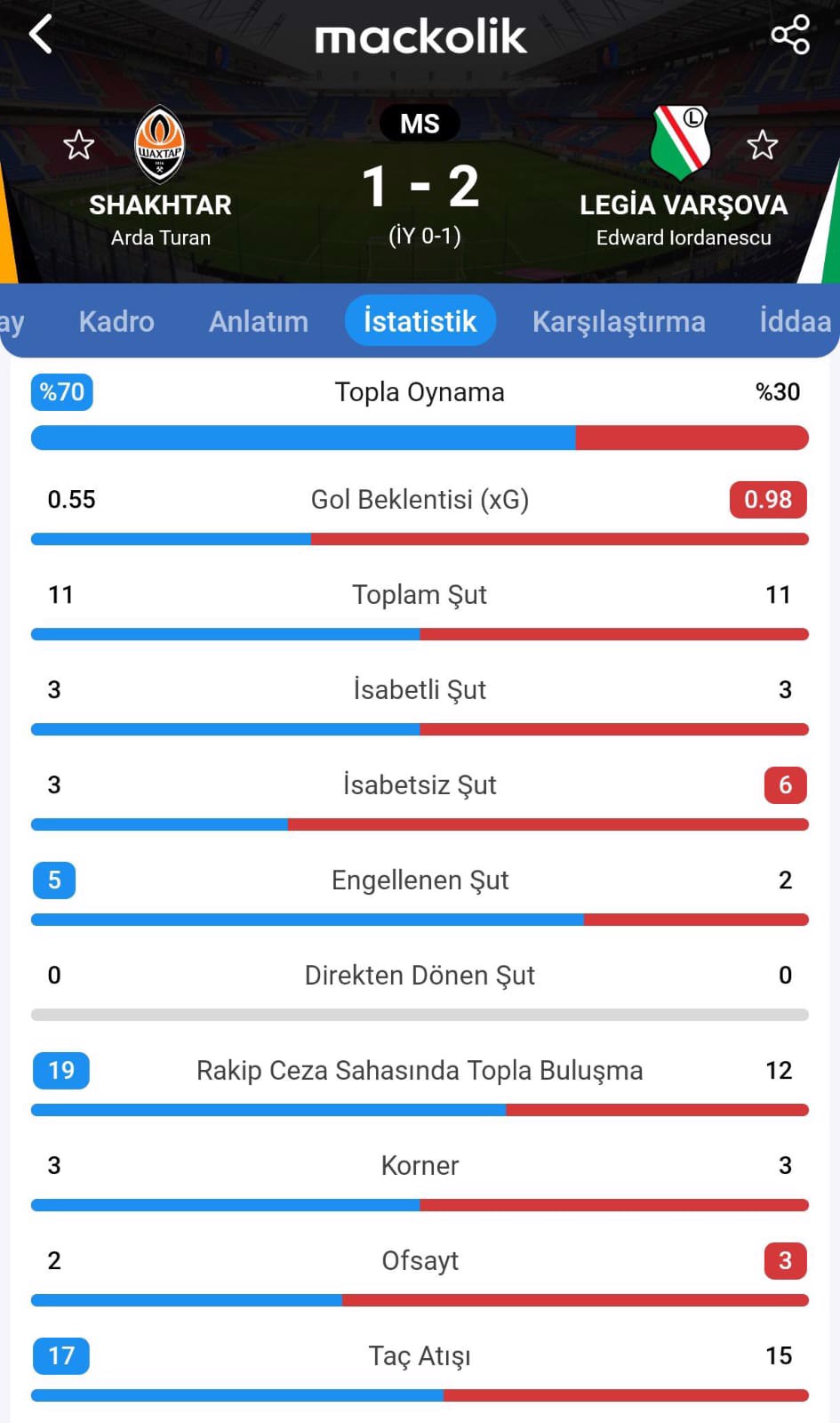 UEFA Konferans Ligi'nin 2. haftasında Arda Turan yönetimindeki Shakhtar Donetsk, Legia Varşova'yla karşılaştı.
