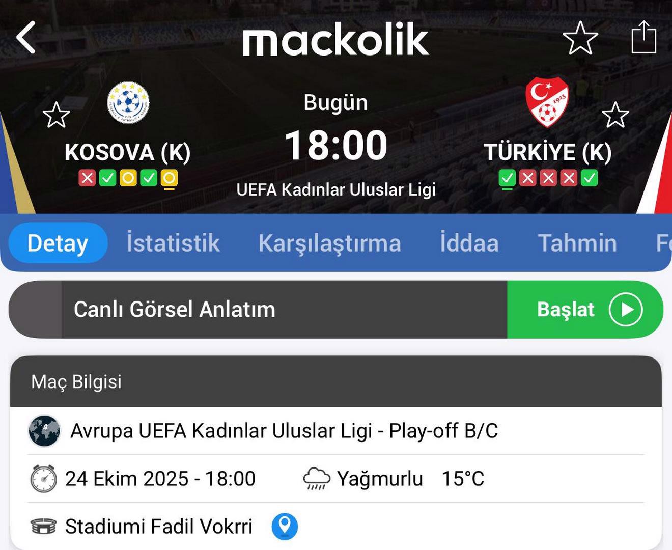 Fadil Vokrri Stadı'nda saat 18.00'de başlayacak müsabakayı Çekyalı hakem Michaela Pachtova yönetecek.