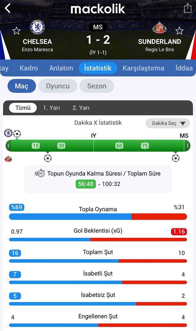 Stamford Bridge'de oynanan mücadelede gol perdesini 4. dakikada Garnacho açtı. Arjantinli, Chelsea formasıyla ilk golünü kaydetti.