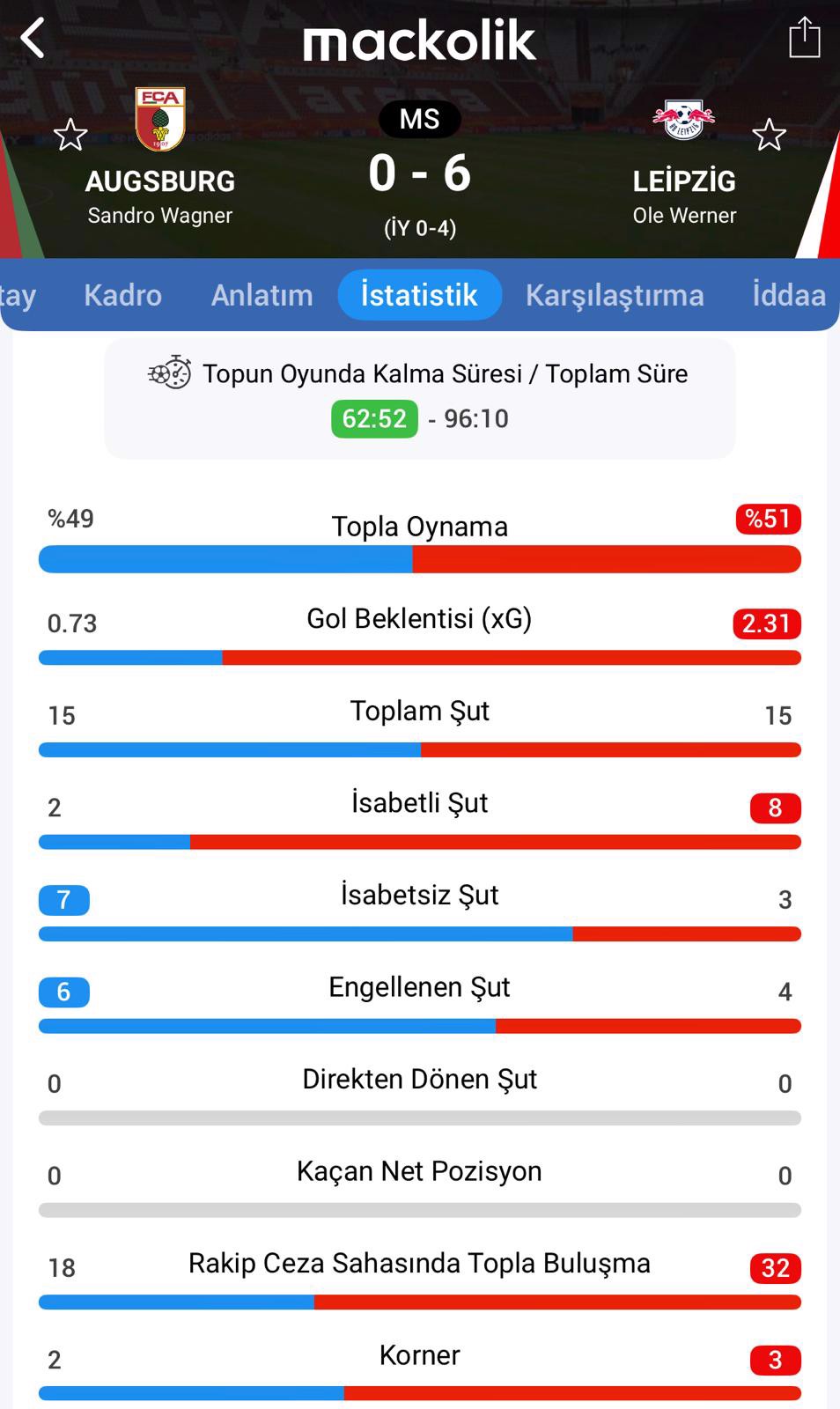 Bu sonuçla Augsburg ligde 7 puanda kalırken Leipzig 19 puana yükselerek 2. sıradaki yerini korudu.