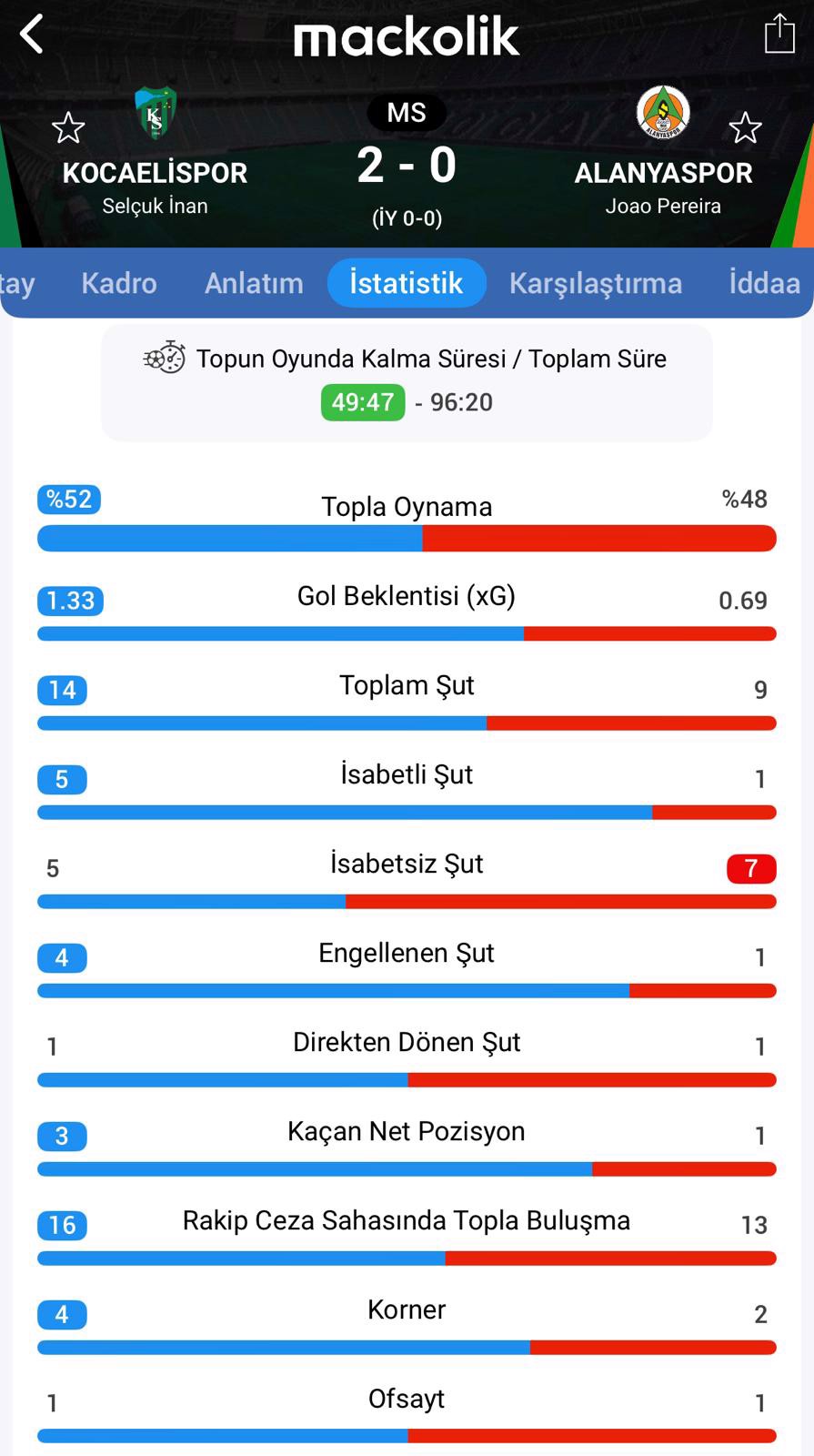 62. dakikada Kocaelispor öne geçti. Ceza sahası içinde topla buluşan Tayfur Bingöl, röveşata vuruşuyla meşin yuvarlak fileleri havalandırdı: 1-0.