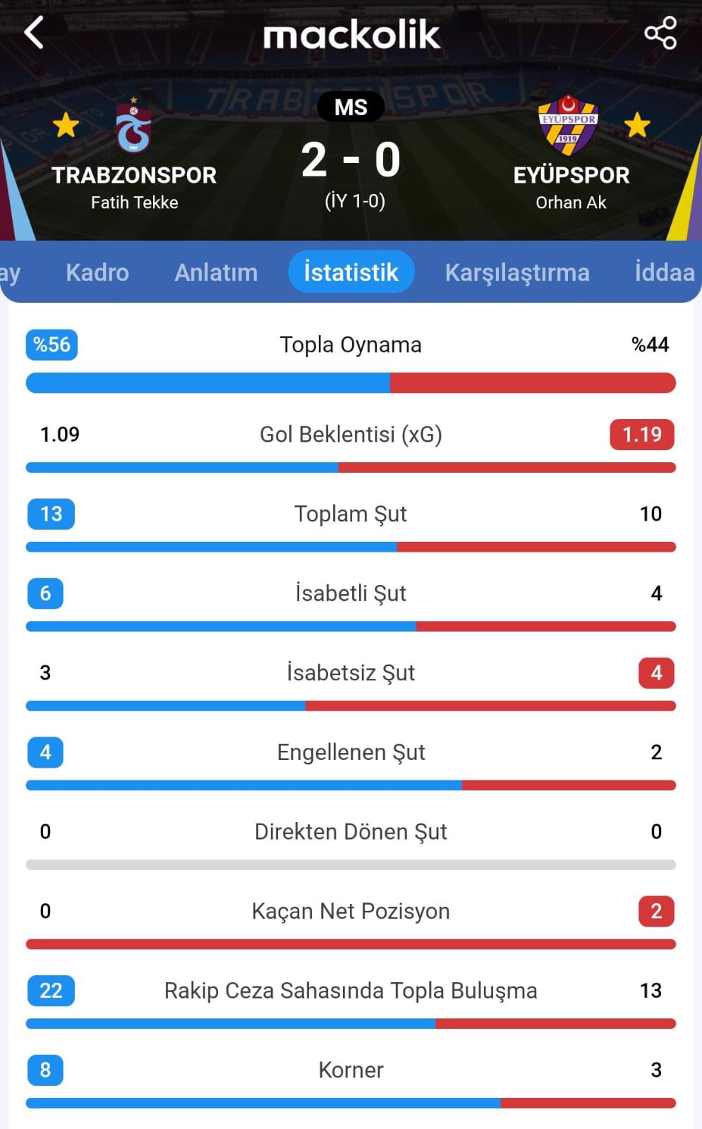 Karşılaşmada başka gol olmadı ve Trabzonspor, evinde Eyüpspor'u 2-0 mağlup etti.
