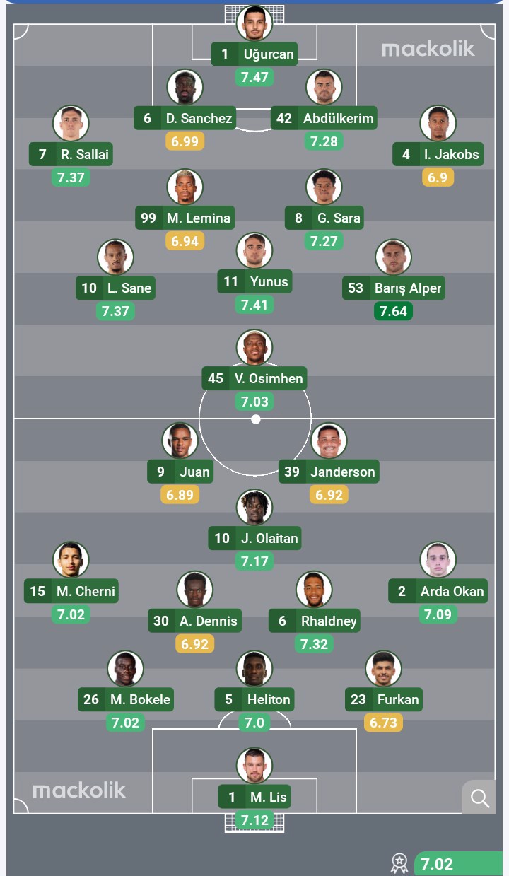 Galatasaray: Uğurcan Çakır, Sallai, Sanchez, Abdülkerim Bardakcı, Jacobs, Lemina, Sara, Sane, Yunus Akgün, Barış Alper Yılmaz, Osimhen