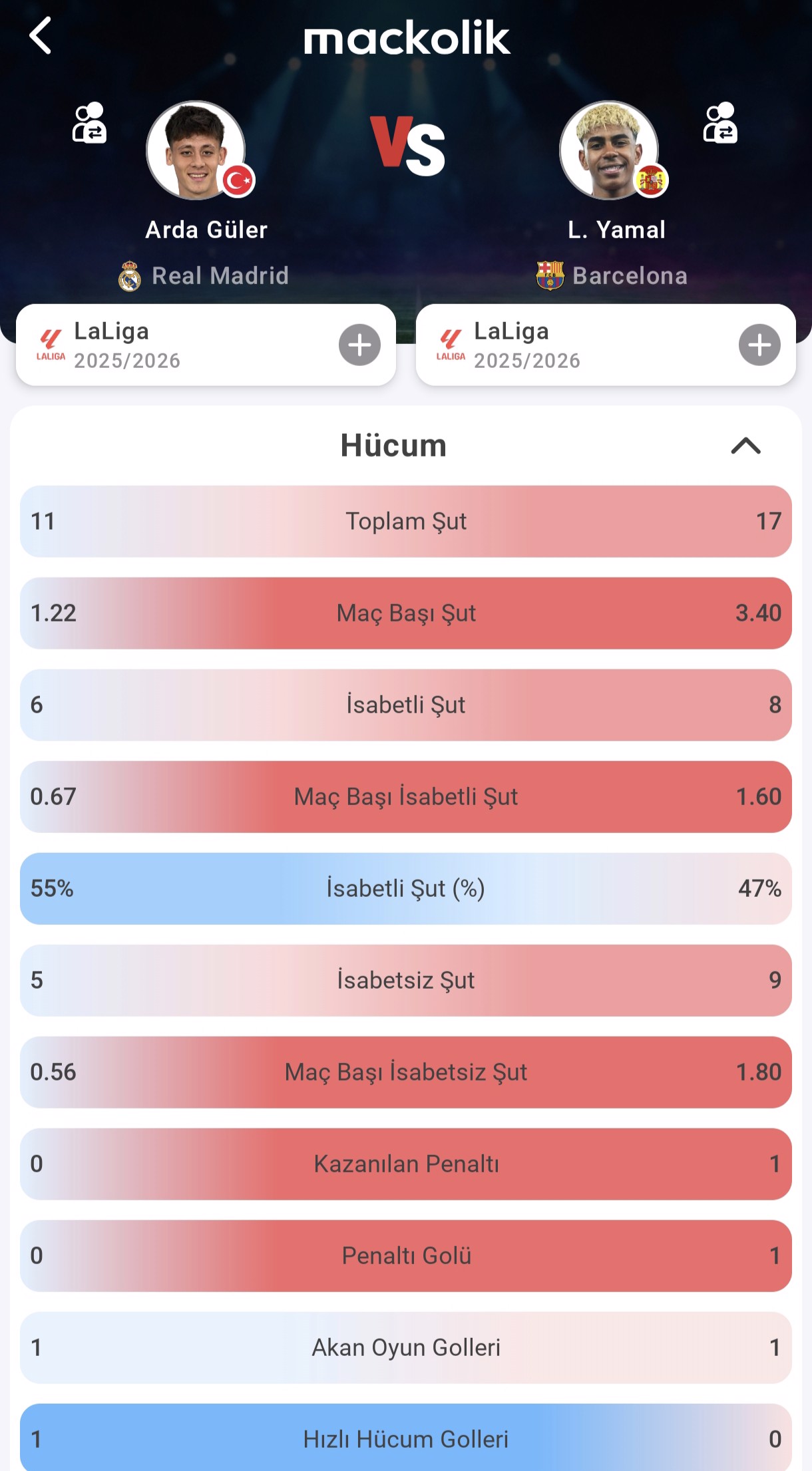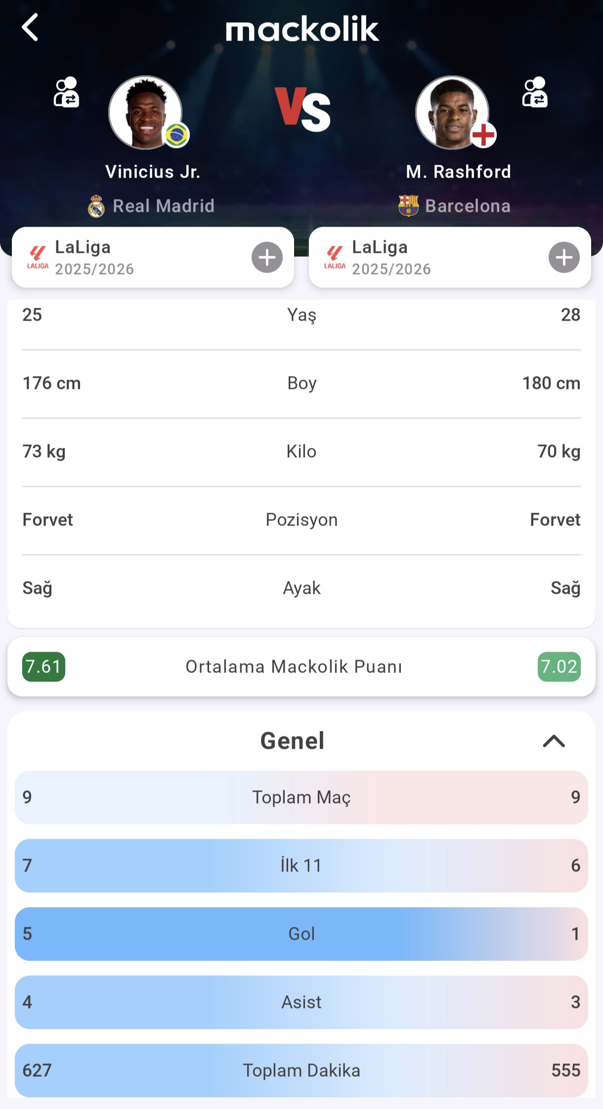 El Clasico'da Real Madrid ve Barcelona karşı karşıya gelecek. Milli yıldızımız Arda Güler'le Lamine Yamal'ı ve Vinicius Jr. ile Marcus Rashford'ı Mackolik?in Oyuncu Karşılaştırma özelliğiyle inceledik.