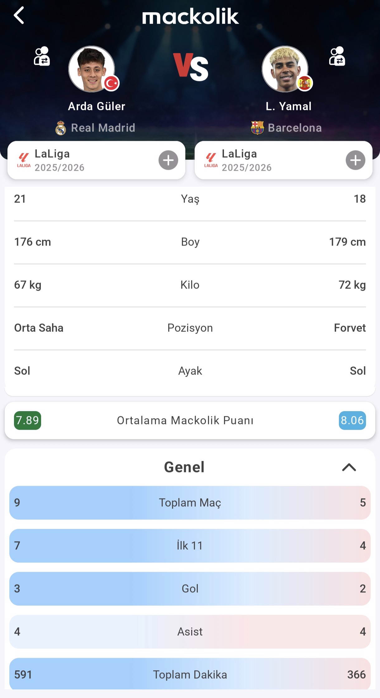 Yamal ise Barcelona formasıyla 5 maçta görev aldı, bunların 4'ünde ilk 11'deydi. 366 dakika süre alan genç yıldız, 2 gol ve 4 asist üreterek doğrudan 6 gole katkı sağladı. Ortalama puanı 8.06 olan Lamine Yamal, istatistiklerde Arda Güler'e oldukça yakın bir performans sergiliyor.