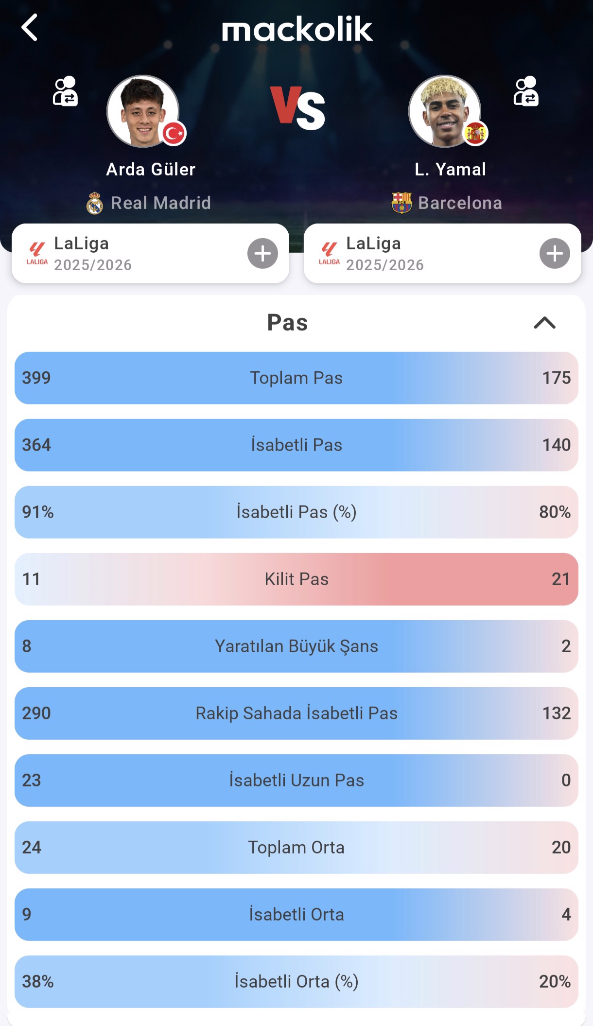 Barcelona cephesinde Lamine Yamal, hücum hattında daha doğrudan bir rol üstleniyor. Genç kanat oyuncusu, 175 pas denemesinde %80 isabet oranıyla oynarken, 21 kilit pas üreterek farkını yaratıcılığıyla gösterdi. 2 büyük şans yaratan Yamal, özellikle dar alanda kısa kombinasyonlarla etkili oluyor. Kanat üzerinden yaptığı 20 orta denemesinin 4'ü isabetli, bu da onun daha riskli ama tehditkâr bir hücum tarzı benimsediğini gösteriyor.