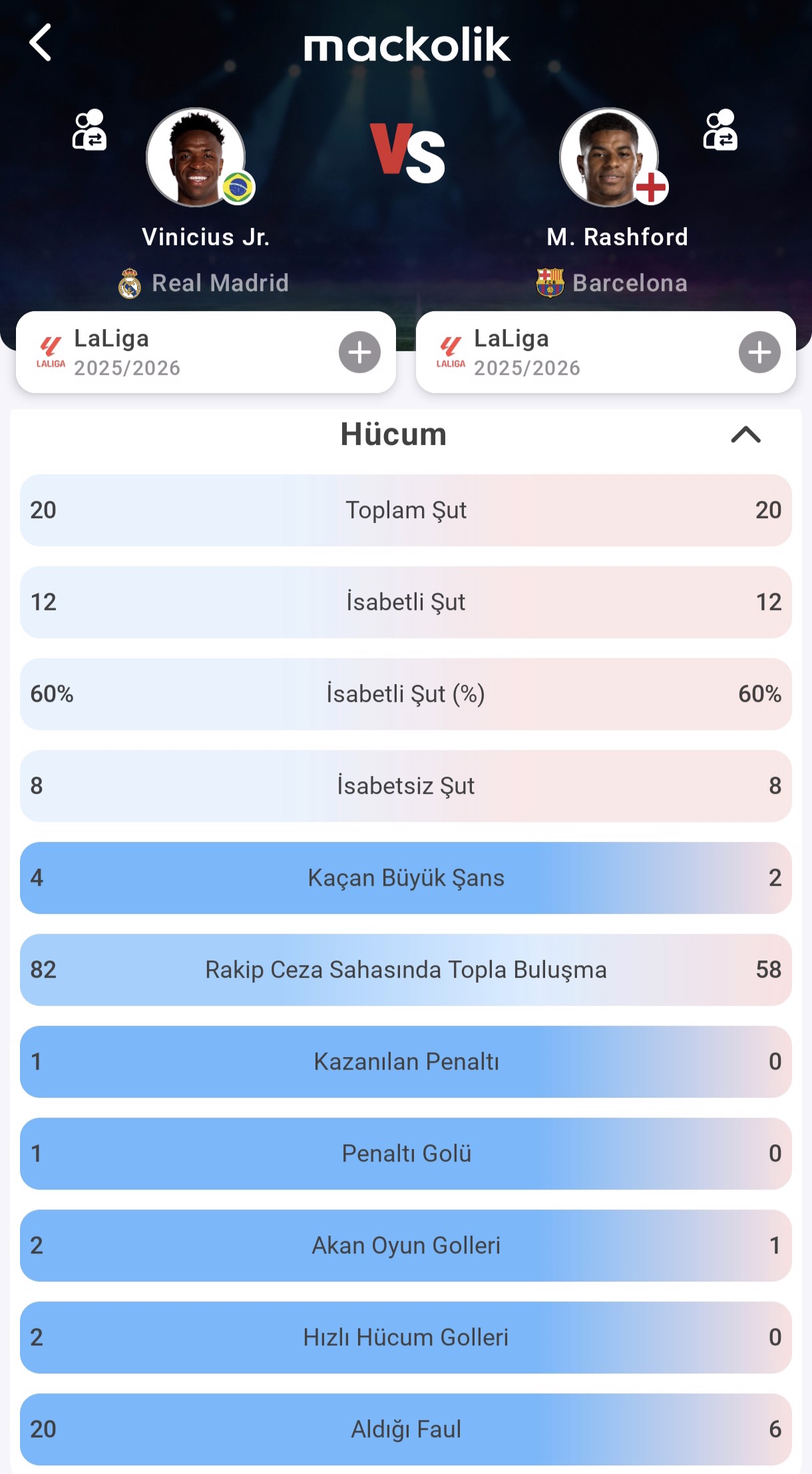 Her iki kanat oyuncusu da bu sezon LaLiga'da benzer sayıda şut girişiminde bulundu. Vinicius Junior ve Marcus Rashford'un 20'şer şutu bulunurken, bu şutların 12'si isabetli oldu. İki yıldız da %60'lık şut isabet oranı yakalayarak yüksek bir bitiricilik seviyesi ortaya koydu.