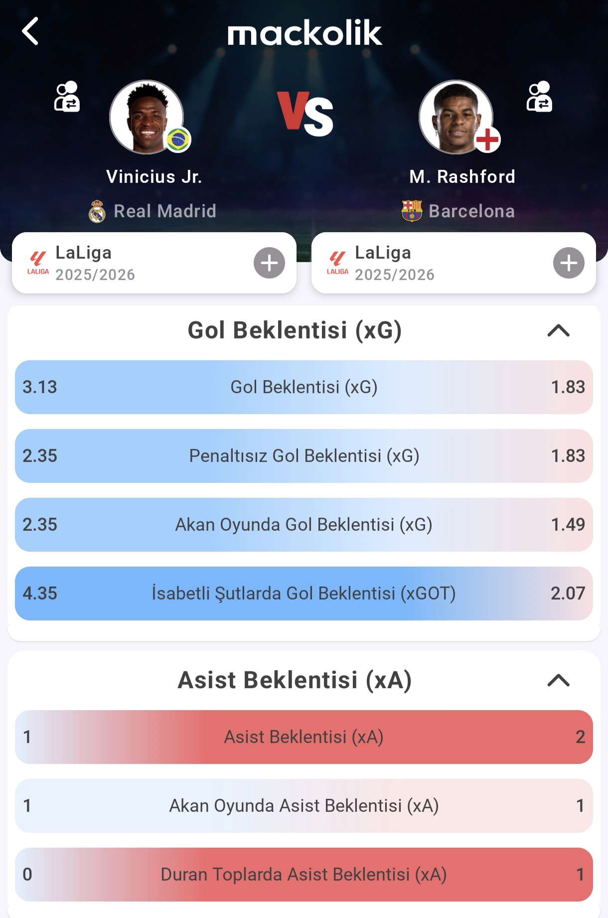 Asist üretkenliğinde ise tablo tersine dönüyor. Vinicius'un asist beklentisi (xA) değeri 1.00 olurken, Rashford'un 2.00 xA ile bu alanda üstünlük sağladığı görülüyor. İngiliz yıldızın duran toplarda 1 asist beklentisi yaratması, Barcelona'nın set hücumlarında ona daha stratejik bir sorumluluk yüklediğini gösteriyor.