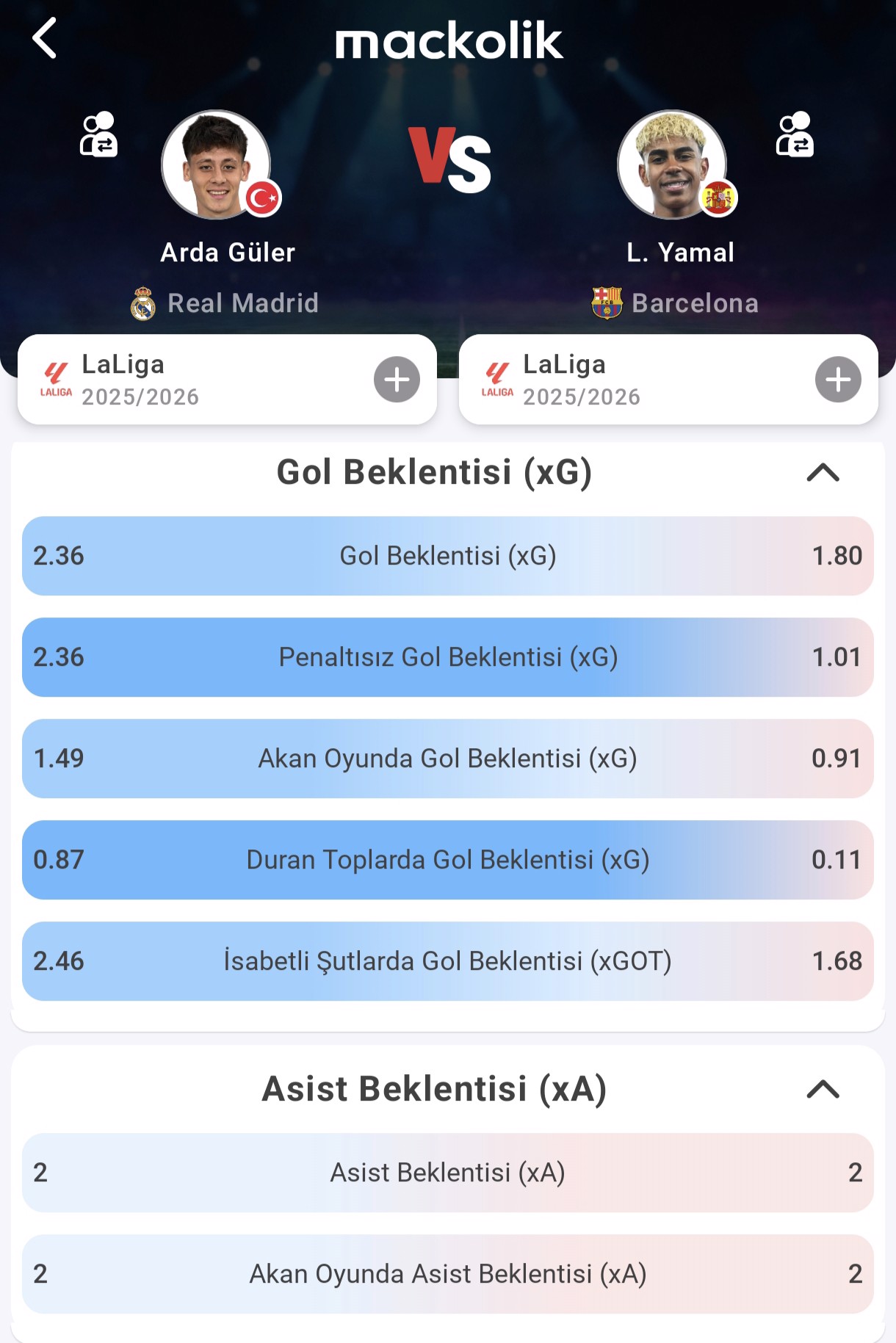 Her iki oyuncu da pas bağlantılarında fark yaratıyor. Arda Güler'in asist beklentisi (xA) 2.00 olarak kaydedilirken, Yamal'ın da aynı şekilde 2.00 xA değeri bulunuyor. Bu da iki oyuncunun yalnızca bitirici değil, aynı zamanda yaratıcı yönlerinin de takımlarında ne kadar önemli olduğunu gösteriyor.