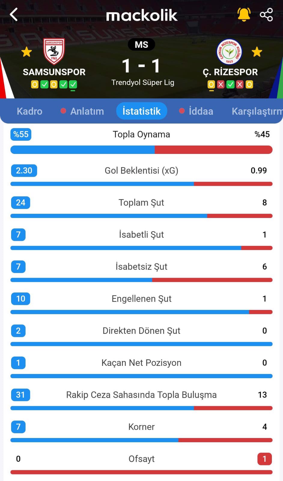 Bu sonuçla Samsunspor 17, Rizespor ise 10 puana yükseldi.