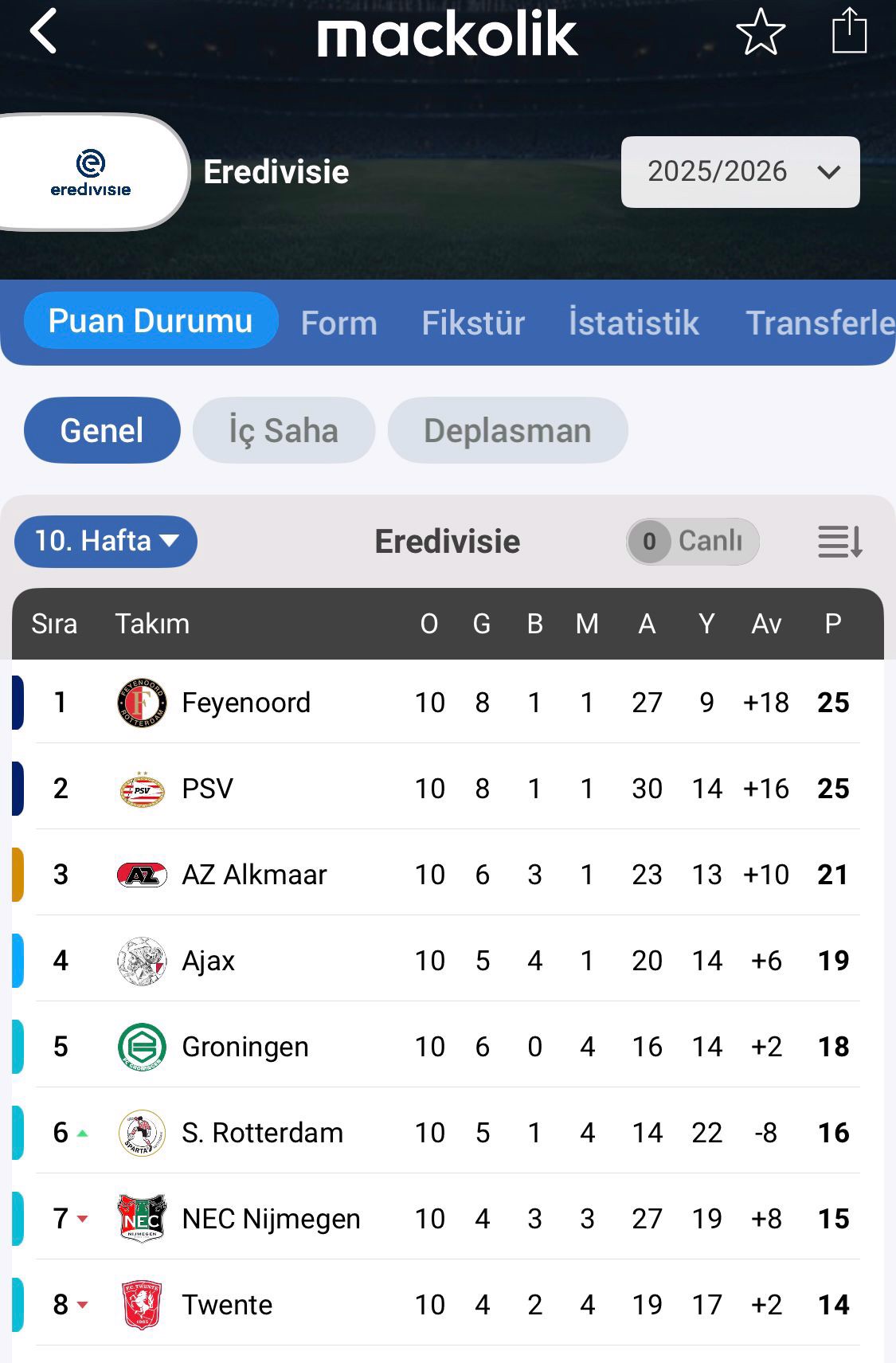 8 Ağustos'ta başlayan ligde Feyenoord ve PSV Eindhoven 25'er puanla zirveyi paylaşırken, AZ Alkmaar 21 puanla üçüncü sırada takibini sürdürüyor. Eredivisie'de 37 şampiyonlukla en fazla kez mutlu sona ulaşan Ajax ise 19 puanla dördüncü basamakta yer alıyor.