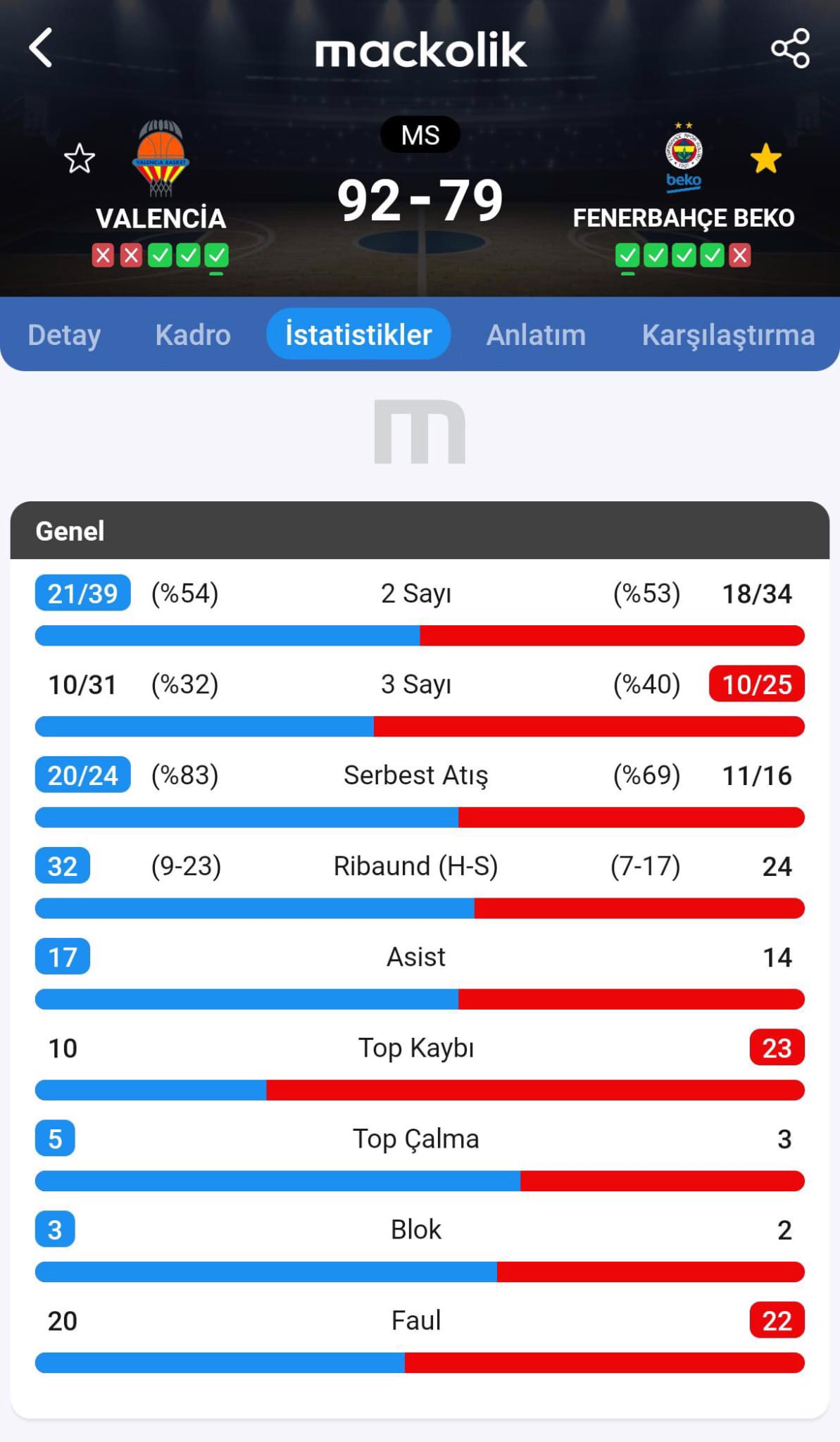 Son bölümde temsilcimiz bulduğu sayılarla farkı kapatmaya çalışsa da Valencia, Fenerbahçe Beko'yu 94-79 mağlup eti.