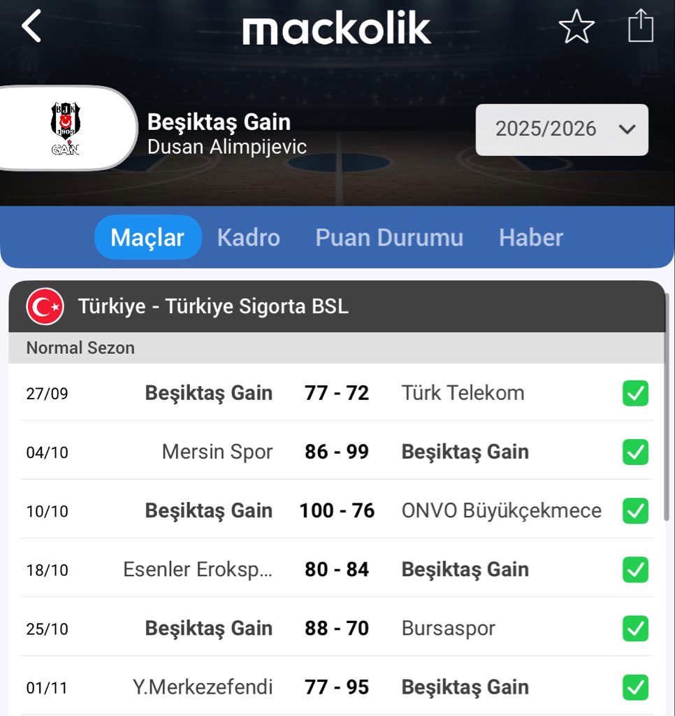 Sezonun ilk haftasında Türk Telekom'u 77-72 yenen Beşiktaş Gain; Mersin Spor'u 99-86, Büyükçekmece'yi 100-76, Esenler Erokspor'u 84-80, Bursaspor'u 88-70 ve Yukatel Merkezefendi'yi 95-77 mağlup etmeyi başardı.