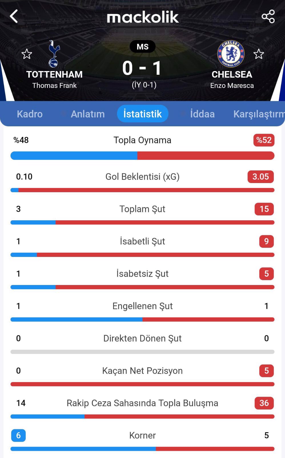 Bu galibiyetle Chelsea, ligde puanını 17'ye yükseltti. Tottenham ise 17 puanda kaldı.