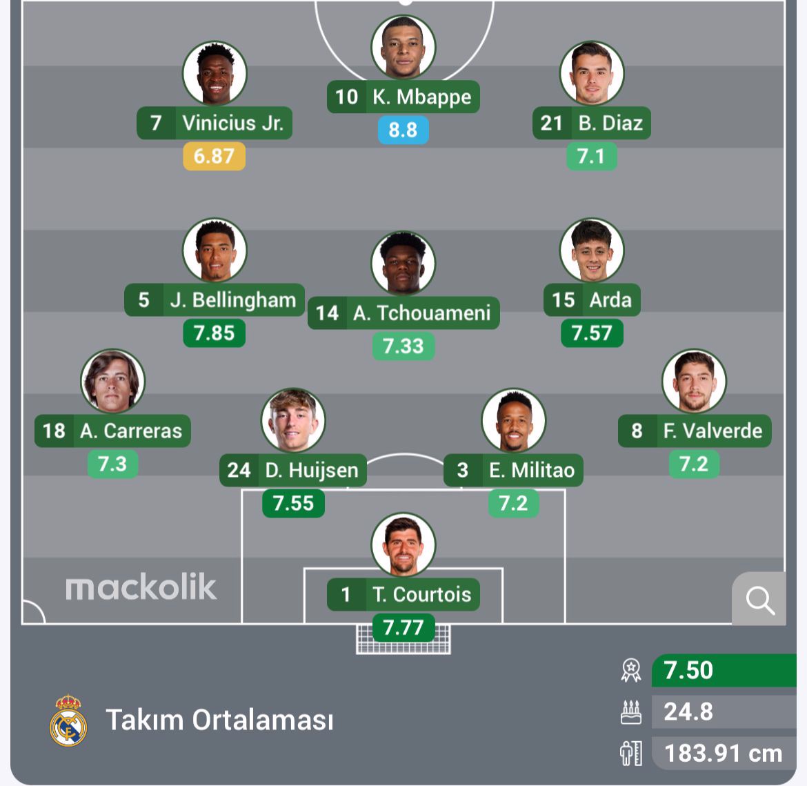 Real Madrid: Courtois, Valverde, Militao, Huijsen, Carreras, Tchouameni, Arda Güler, Bellingham, Diaz, Vinicius, Mbappe