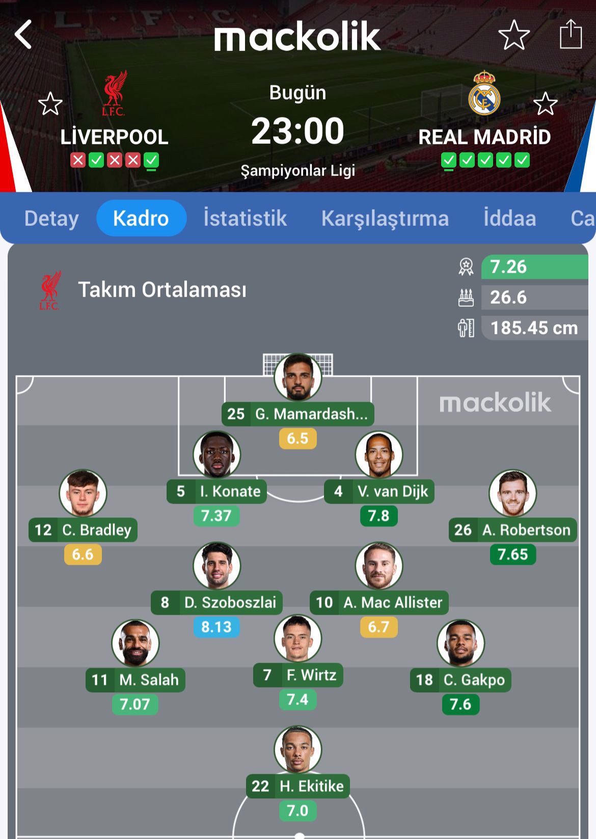 Liverpool'da Isak, Frimpong Alisson ve Curtis Jones'un sakatlıkları nedeniyle forma giymesi beklenmiyor. Real Madrid'de ise Mastantuono, Alaba ve Carvajal'in sakatlıkları sürüyor.