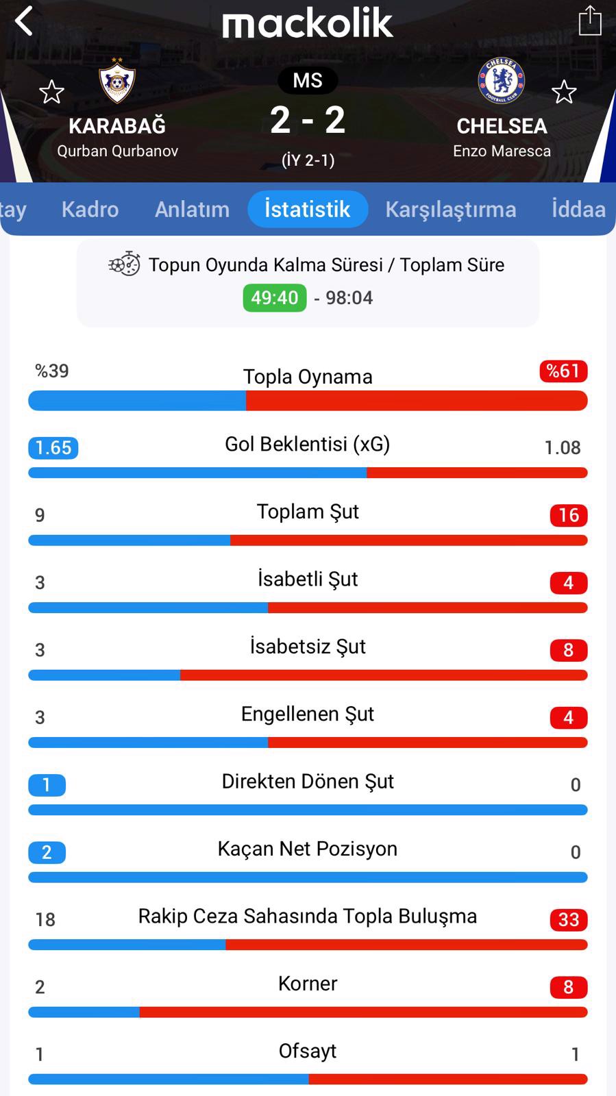39. dakikada penaltı kazanan Karabağ'da topun başına geçen Jankovic, Chelsea ağlarını sarsarak takımını öne geçirdi ve Karabağ devre arasına üstün girdi.