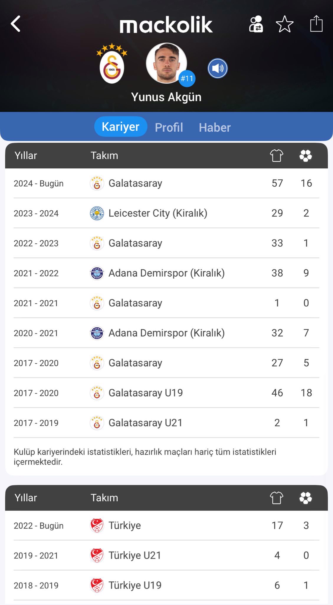 Bu sezon Sarı-kırmızılı formayı toplamda 13 kez giyen Yunus Akgün, 4 gol atıp 2 de asist yaptı.