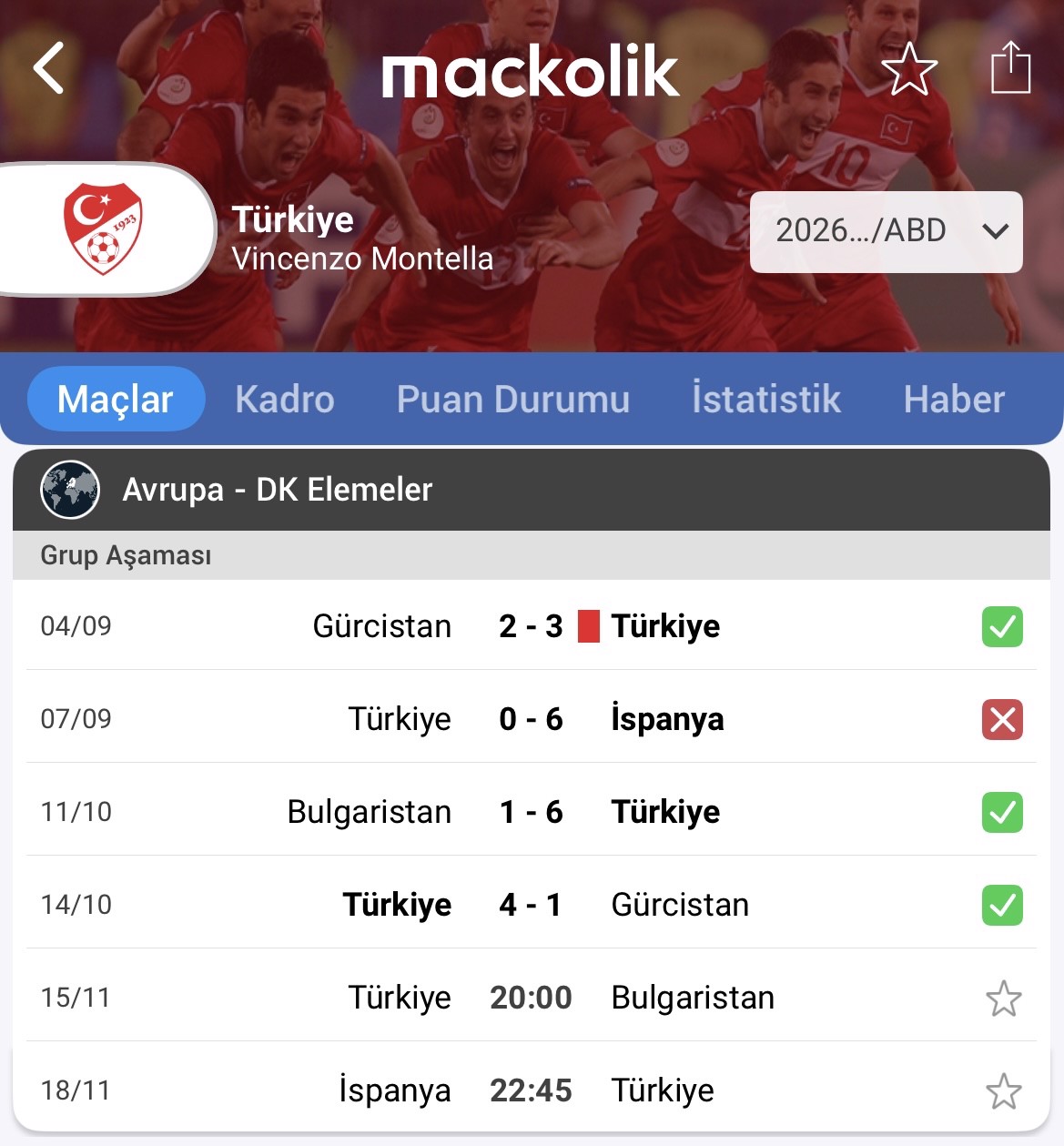 Geride kalan 4 haftada 3 galibiyet ve 1 yenilgi yaşayan ay-yıldızlı ekip, E Grubu'nda 4'te 4 yapan İspanya'nın ardından 9 puanla ikinci sırada yer alıyor.